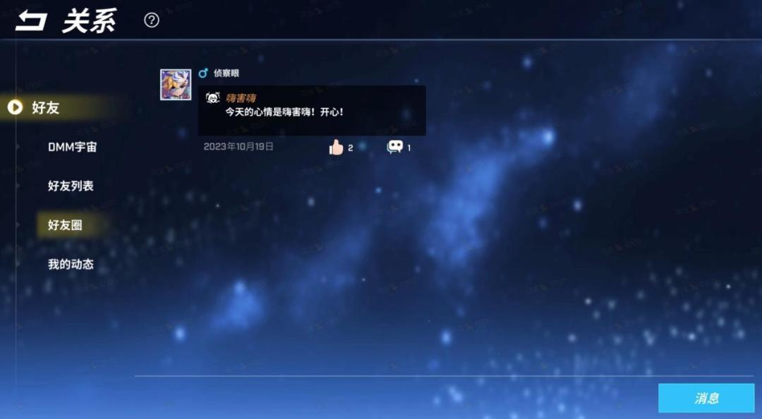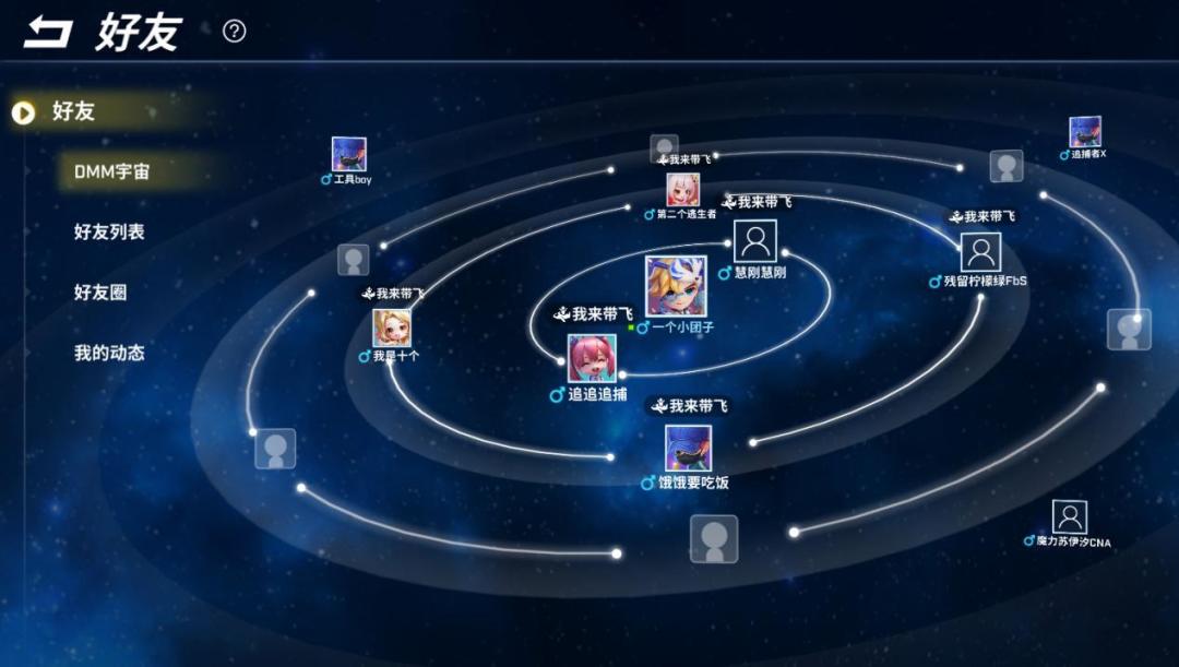 在DMM宇宙中,会展示了以自己为中心的好友关系。宇宙之中,距离的远近受到亲密度高低的影响!