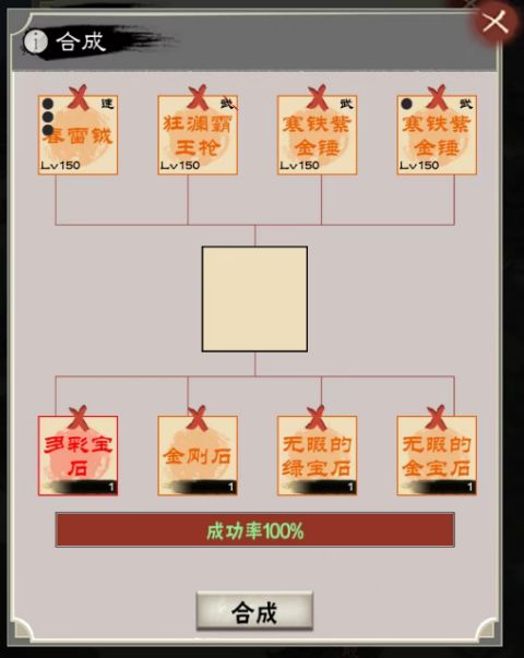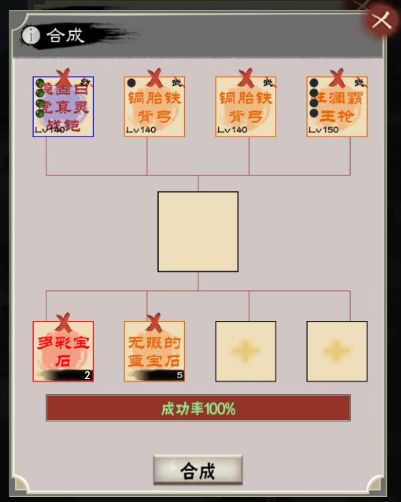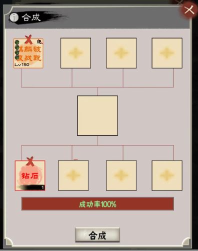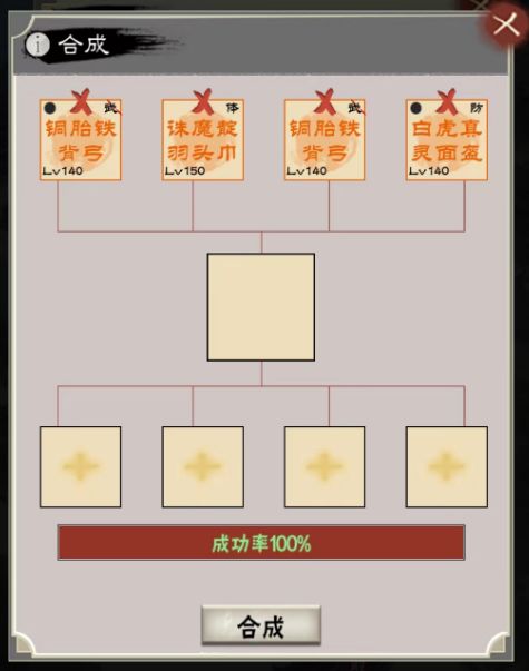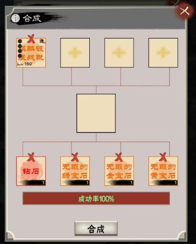 合成里面最简单的一个,在第一行放入4个任意装备(坐骑除外),点击合成,会从4个装备中随机一个产出,品质越高概率越低,但不会颠覆装备本身的品质,比如方天就固定为橙色。且新装备的孔数也会随机生成,即有可能4孔或5孔。