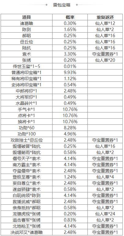 购买后获得手气卡*1、雷包宝箱*1(打开宝箱获得诸葛瞻、郝昭、张绣、毌丘俭、传世玉玺等丰富道具其中之一)
