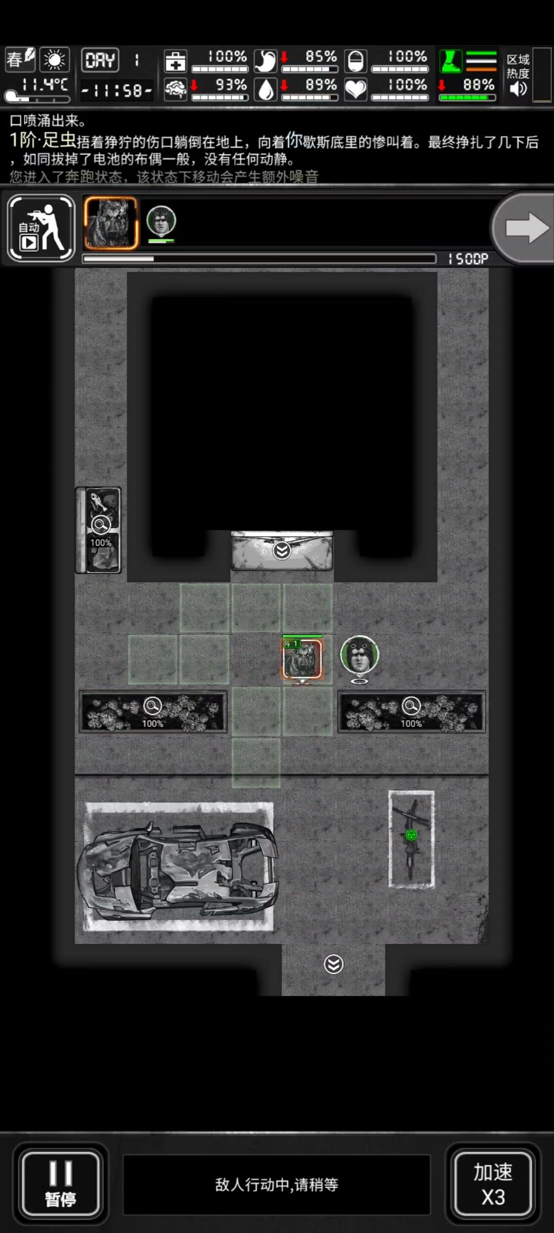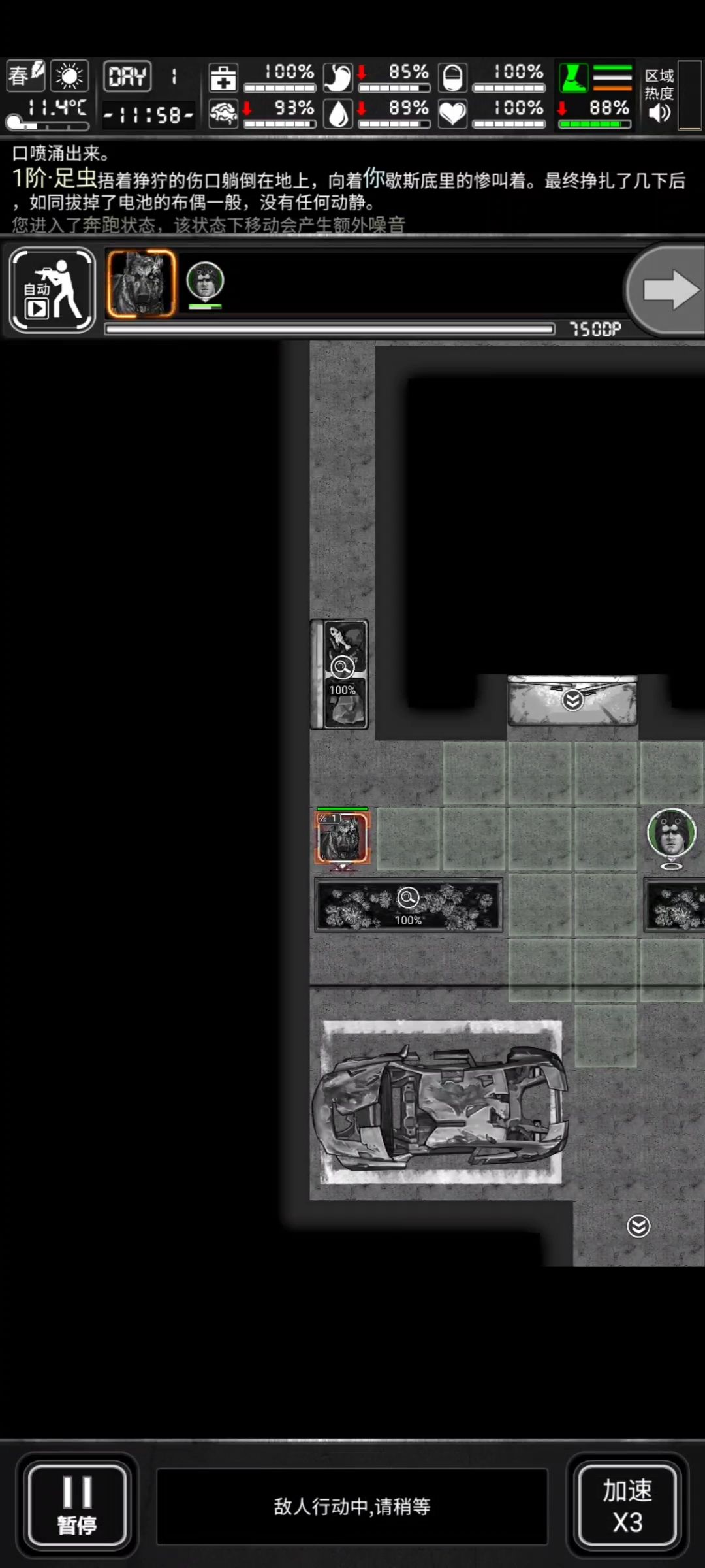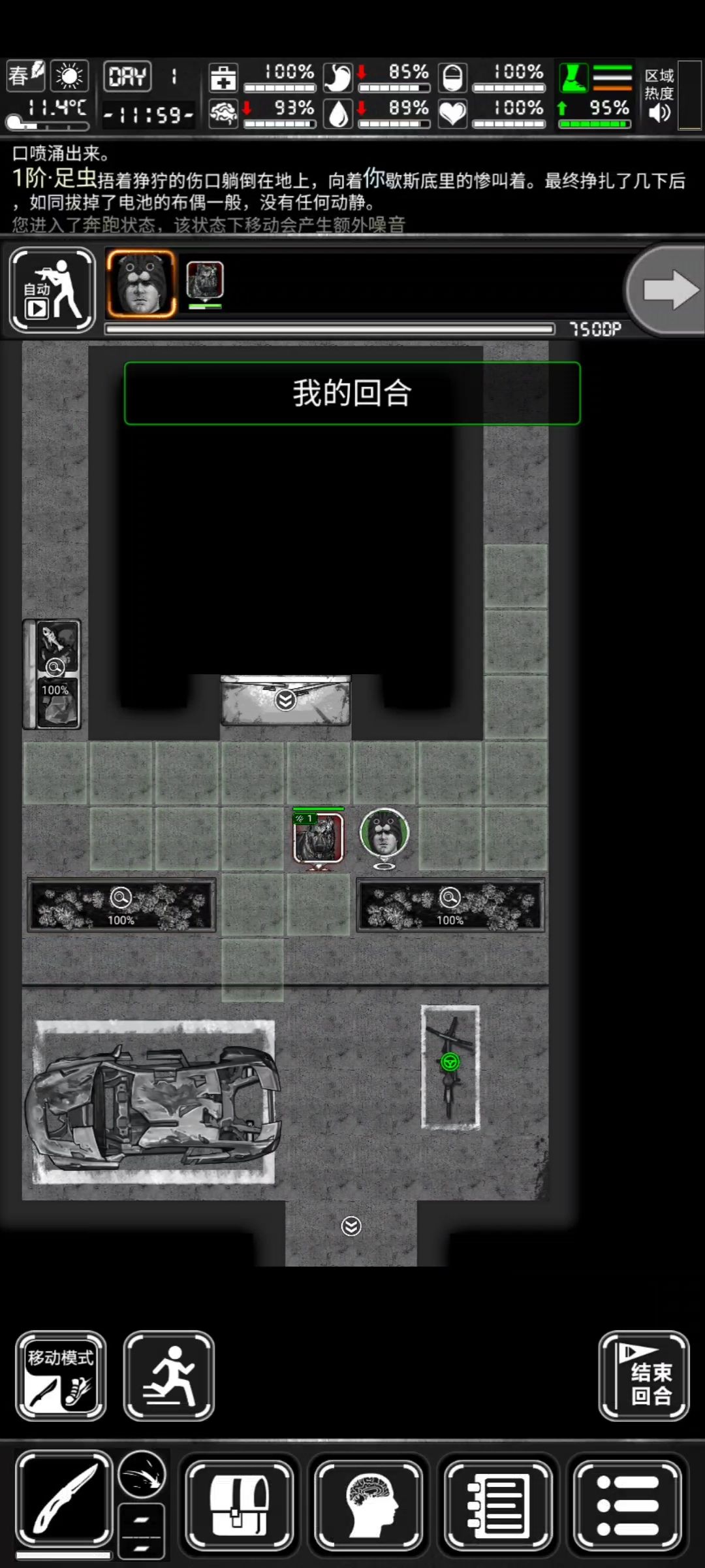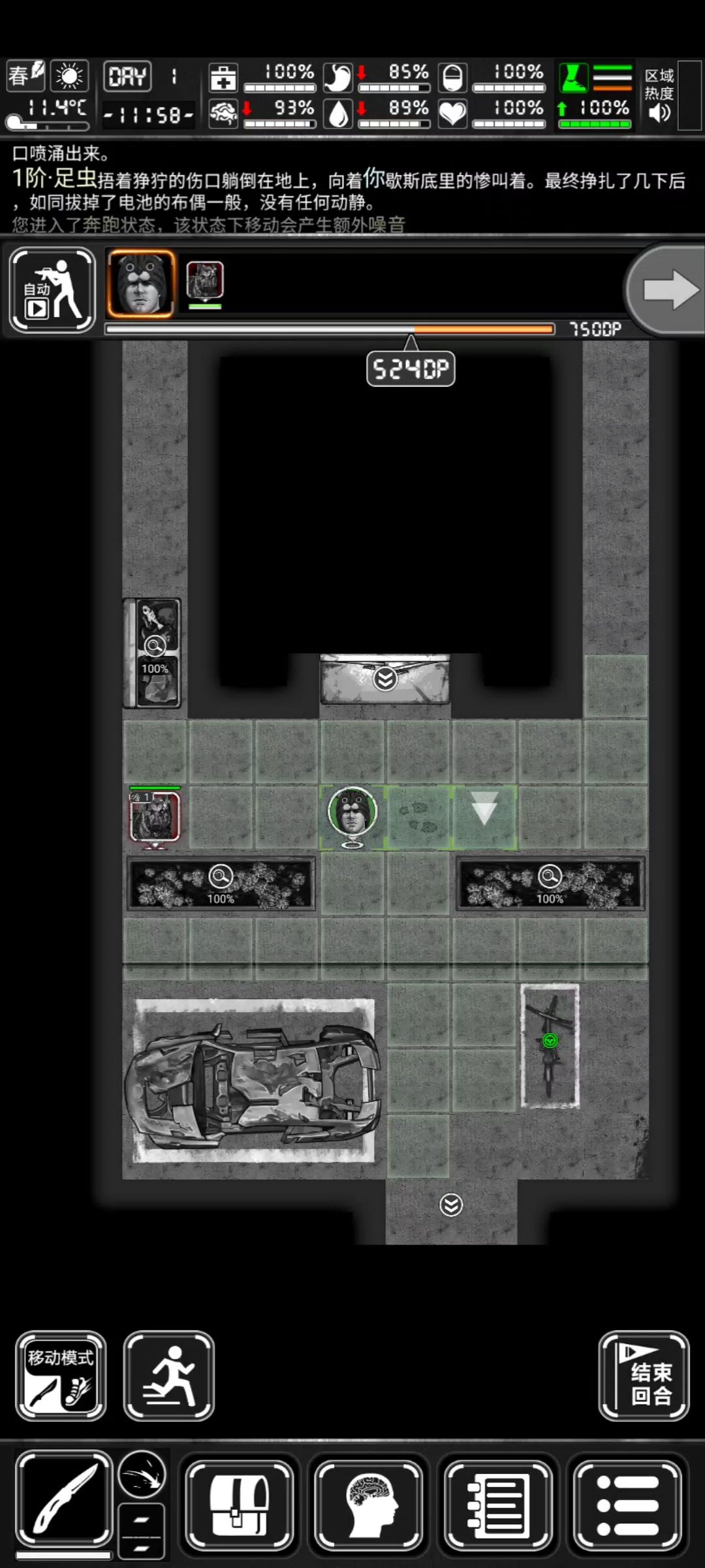 【约里克】的回合内,他使用小刀对【丧尸犬】发动了一次攻击,消耗了102DP,由于他进行了攻击动作,他的回合结束