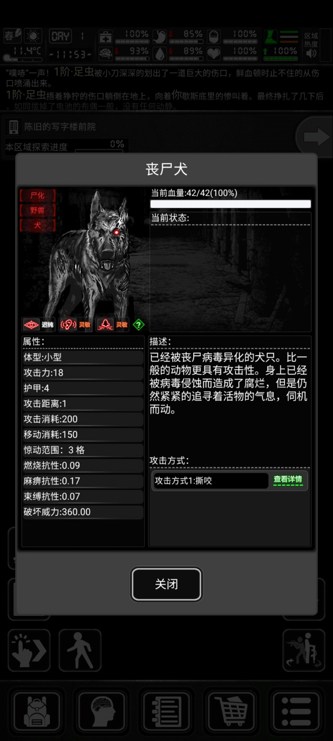 【约里克】的回合内,他再次使用小刀对【丧尸犬】发动了攻击,【丧尸犬】死亡,战斗结束