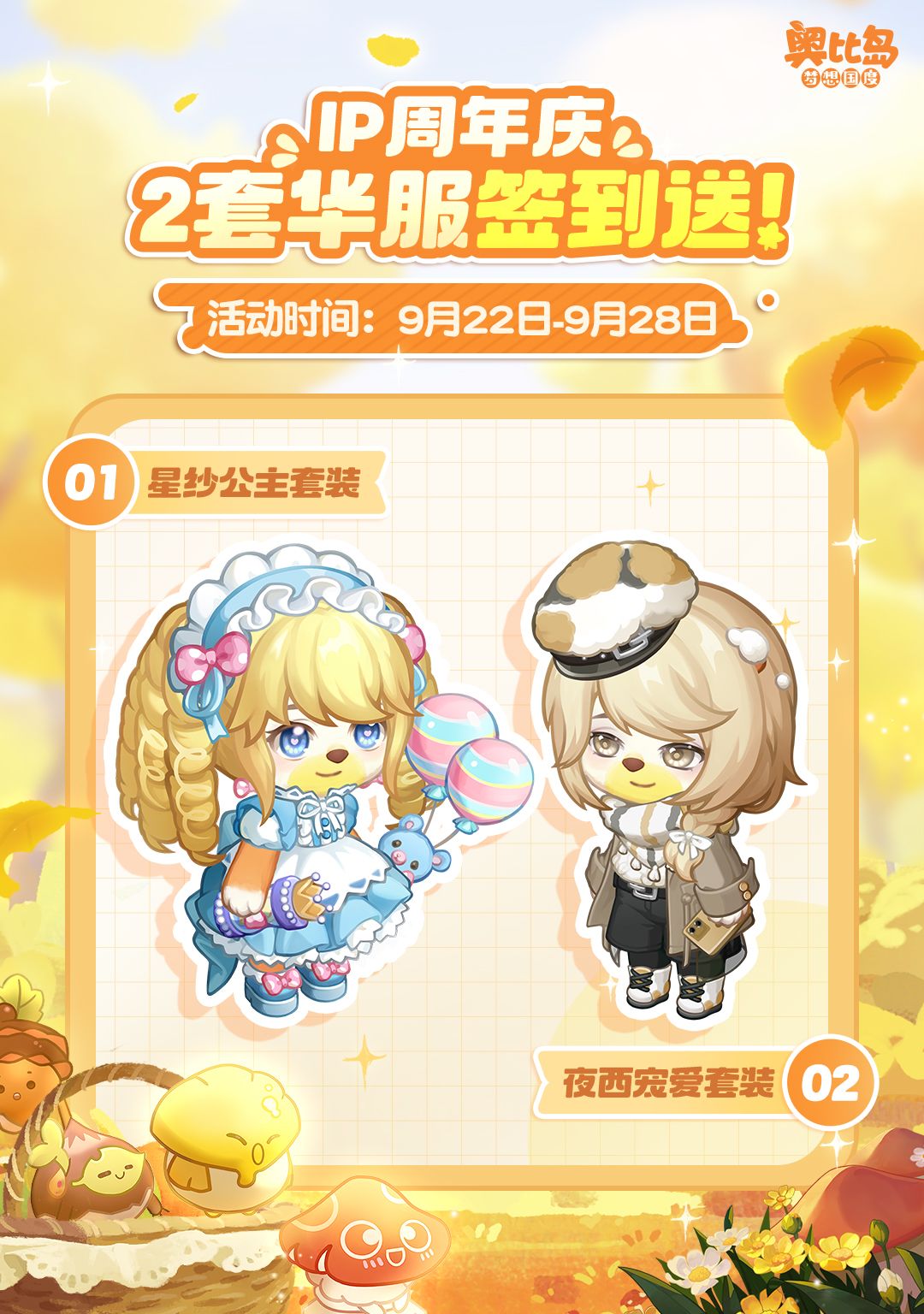 为感谢奥比们的一路相伴,岛务厅为大家准备了惊喜好礼!9月22日上岛前往「奥比庆」-「奥比签到」完成签到任务,即可获得经典回归时装「星纱公主套装」「夜西宠爱套装」、称号「幸福小熊」等礼物!活动期间,进入游戏前往邮箱还可领取「15周年蛋糕头饰」、「吊兰友情树」、「15周年蛋糕分享物」、「晶钻服装彩蛋锤*5」、「晶钻家具彩蛋锤*5」!
