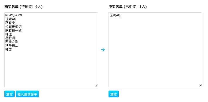 以上两部分名单去重后共10人,按10%中奖率正好抽1个~~通过(百度到的)某抽奖网页进行抽奖,结果如下: