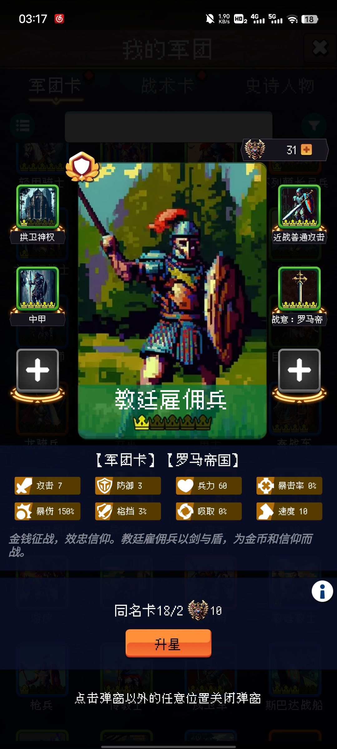 戍卫军的强度在于基础即是蓝卡的数值,可以在局内中平稳过渡到三星到满星枪兵的出现,在打器械队的时候,可以叠加大量的物理增伤。而教廷雇佣兵的强度在于拥有稳定的嘲讽被动技能,可以提早的触发死亡全队增伤和免伤,或是作为满星坦度卡挂回血与光环。两张卡获取难度都非常简单,适合队伍的成型。