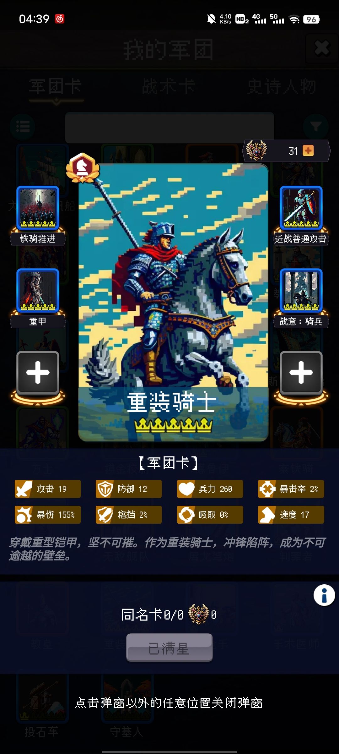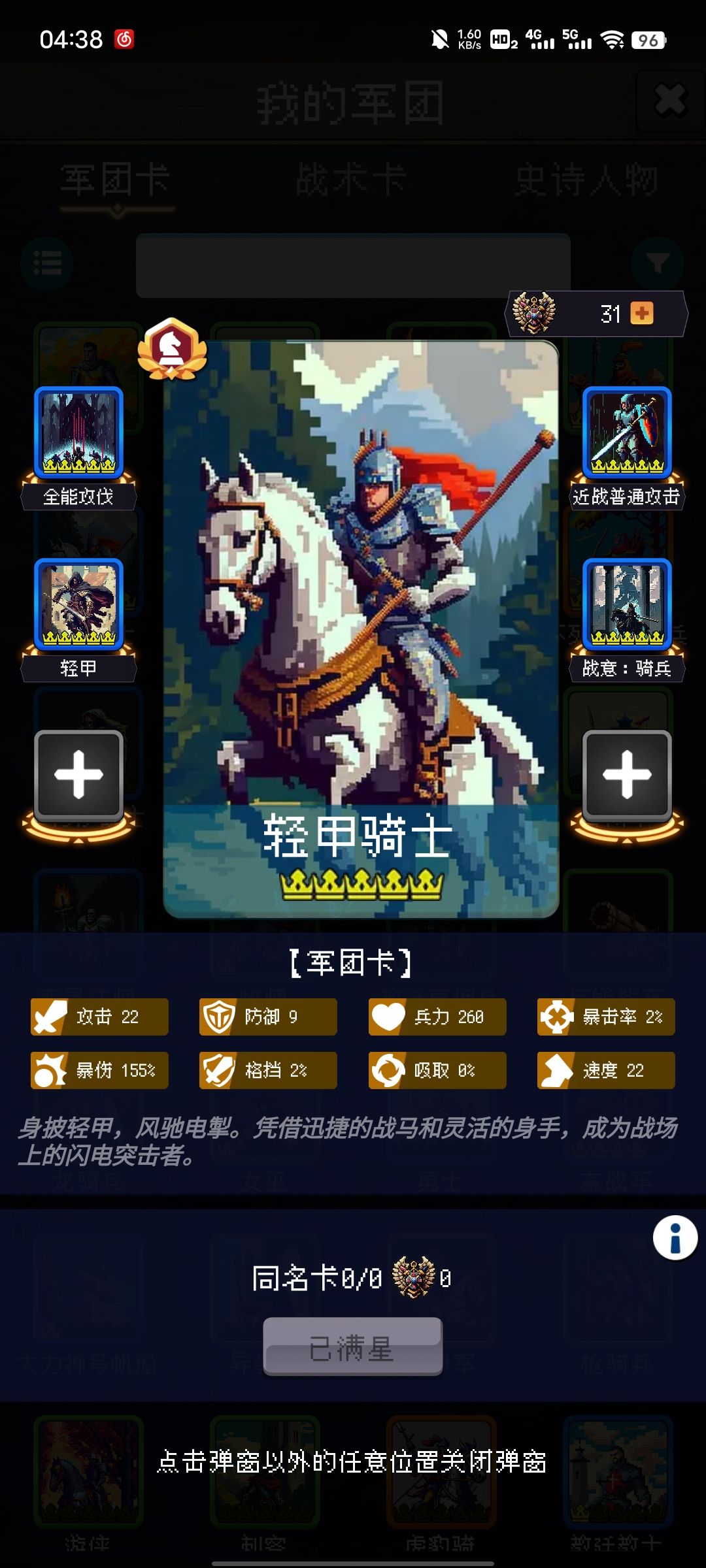 骑兵强度:骑兵强在配队轻松,官方力推,对于整个队伍前期的爆发可以让大伙玩的都特别的舒服,大量的骑兵攻击力政策基本上来说,过150年是轻轻松松的,美中不足的是,缺乏回复和吸血,在获取一些回复卡之后就可以如虎添翼。(小技巧,实在不行给隔壁手术医师偷过来凑合一下