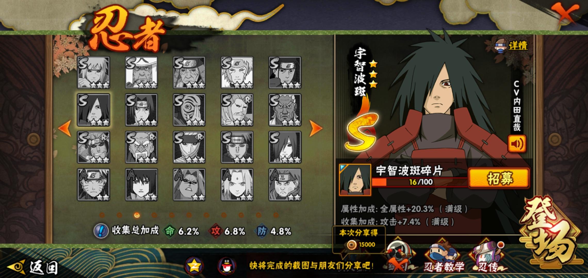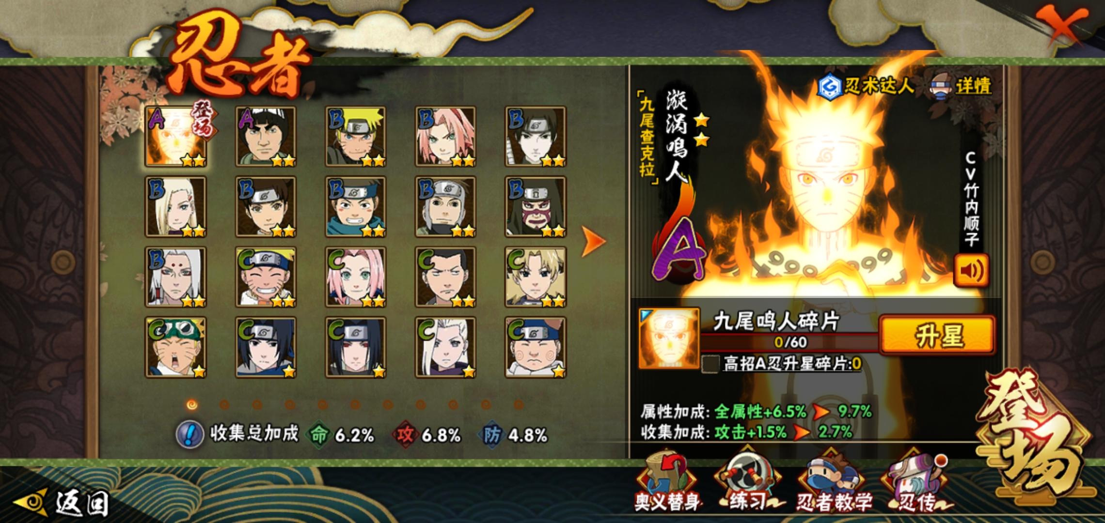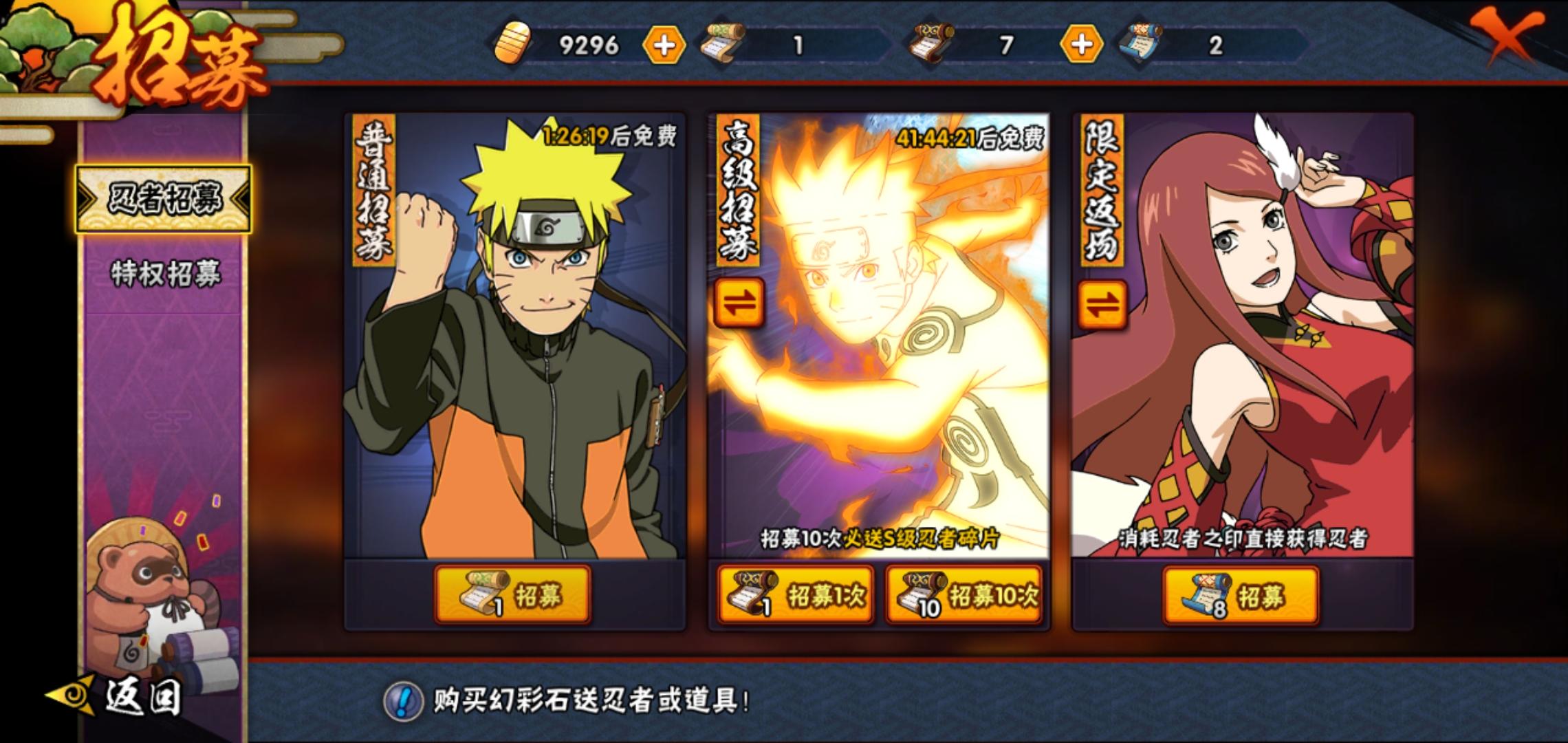 我这是个回归号,以前玩一天就懒得玩了,因为没有喜欢的人物,,这次回归了25天左右吧,从头玩了玩,战力估计跟不上了,,副本都打不过去,,因为金鸣回归的,喜欢鸣人,虽然不厉害哈哈哈哈哈。但是有点动力了。还有35片纲手。16片班,7片四代。