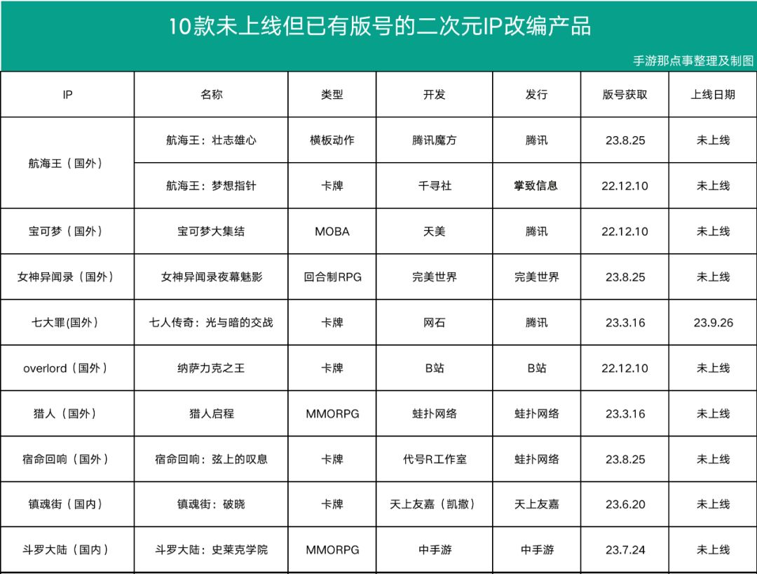 根据手游那点事的不完全统计,近一年国内市场公布或曝光的二次元IP改编产品共27款,其中16款仍然未正式上线,在这16款未上线的产品中已有版号的有10款。这之中不仅有航海王、宝可梦等经典的日漫IP,也有镇魂街、斗罗大陆之类的热门国漫IP,而产品类型更是遍布MMO、动作、回合制、MOBA等主流领域。不难预见,「IP改编」赛道将会变得极为热闹。