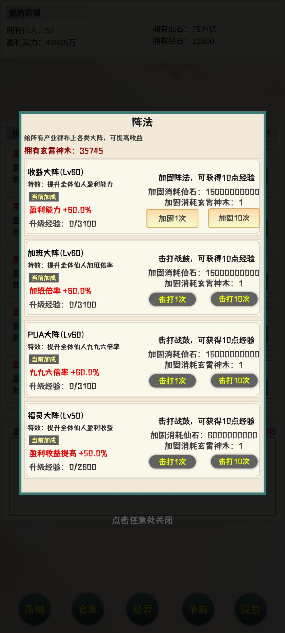 13阵法里面的福灵大阵着重说一下,增加的属性是盈利收益提高,这个属性无法直观看到增益效果,但是对仙石的收入却是有影响的,个人建议四项均分,因为神木用不完,后期消耗仙石巨多。