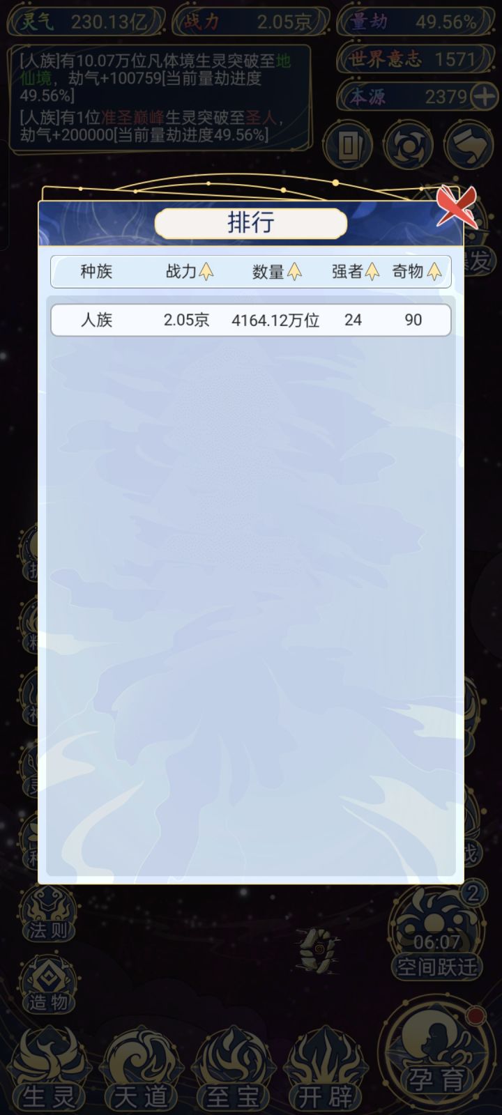 自始至终人族,后面都没意思了,天天没事点两下,战力涨的慢,看新玩法出啥后,再来孕育其他种族