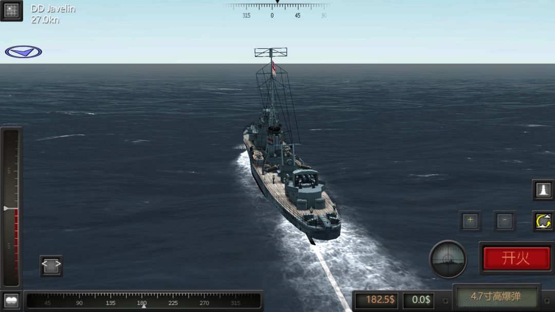 由于使用的都是4.7英寸火炮,所以单发打击力度跟瓦伦丁号一模一样,但是光是正面的弹药投放量就打到了瓦伦丁所有主炮的投放量,击沉敌舰更容易了。(最难受的一点就是,就像下图那样,可能是因为反潜深弹的原因,J级的最后面一门双联装主炮,居然不能朝正后方向开炮!因此我吃了不少亏。注意,这不是bug。)