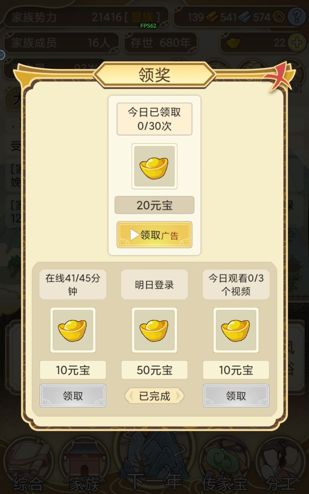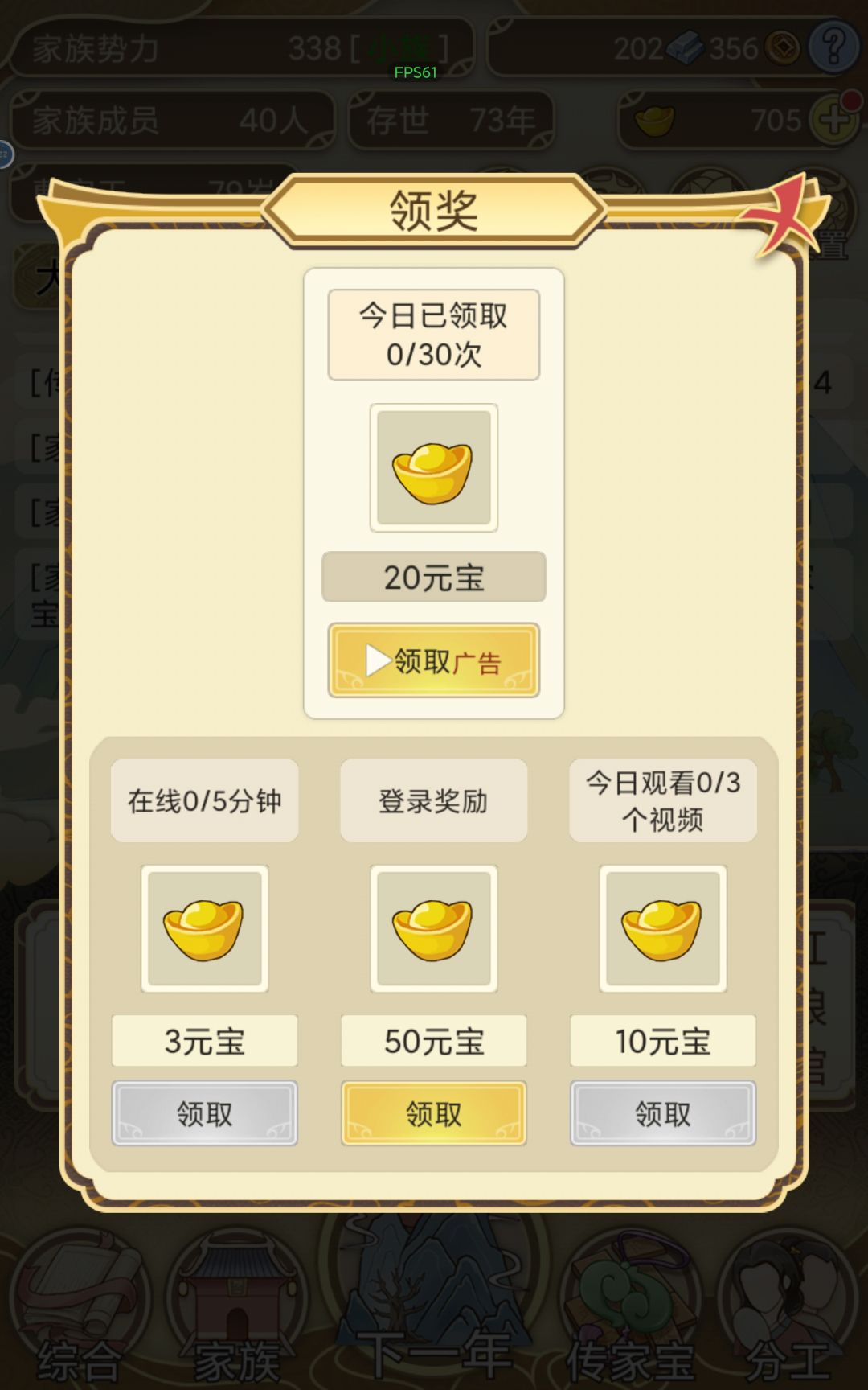 1、开局选生孩子给3元宝,然后可以通过调整系统时间重复领取登录奖励50元,可以一次多调几天,到上限差不多有7000,配合生孩子给3元宝完全不缺元宝