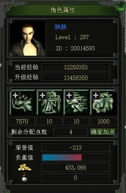 在属性面板上,可以看到角色基本属性,角色等级、升级经验、属性加点等功能都在这里可以看到。