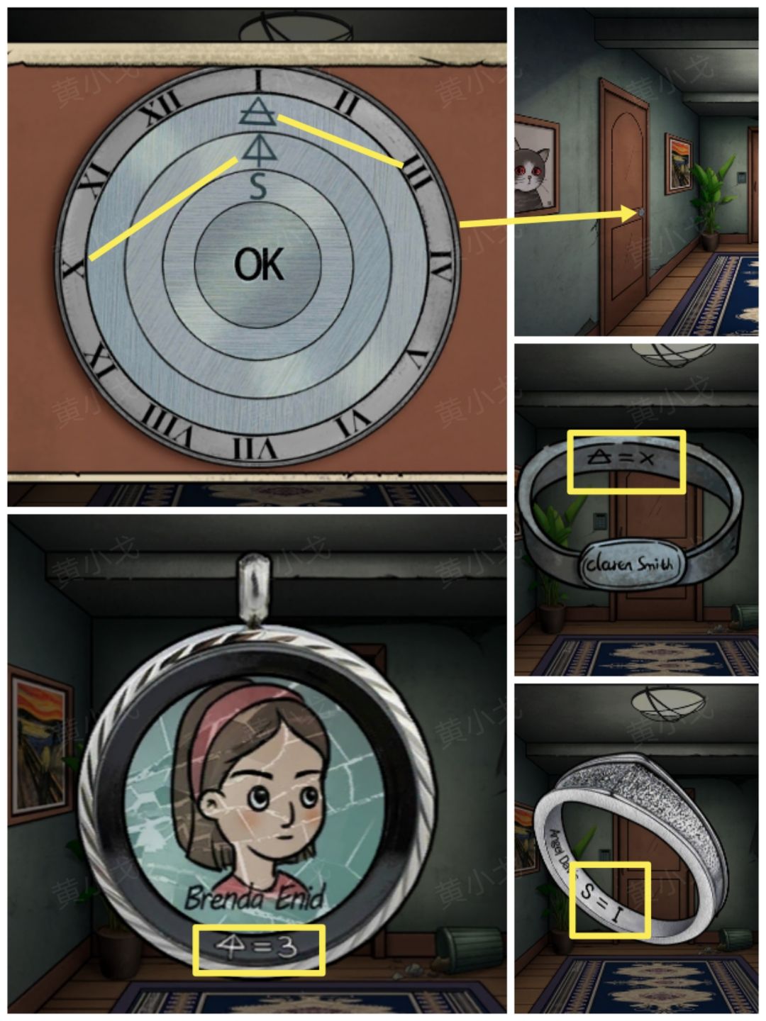 13.点击左边门上的密码锁,根据上面的符号,结合【戒指】(S=I)、【吊坠】(三角形➕竖线=3)和【手环】(三角形➕横线=x)上的线索,调整密码锁上的符号至对应的罗马数字,打开门,进入学生宿舍