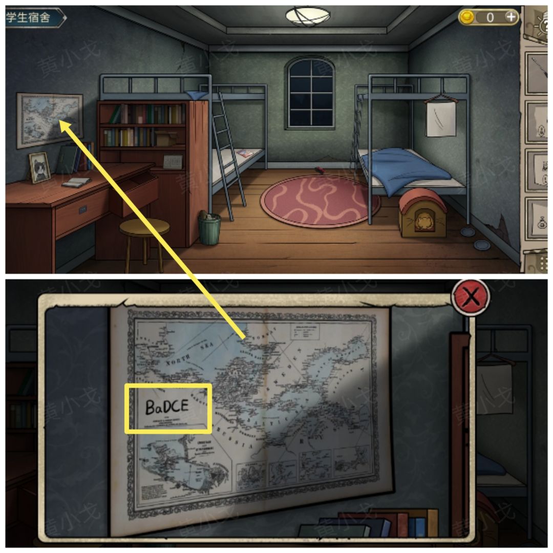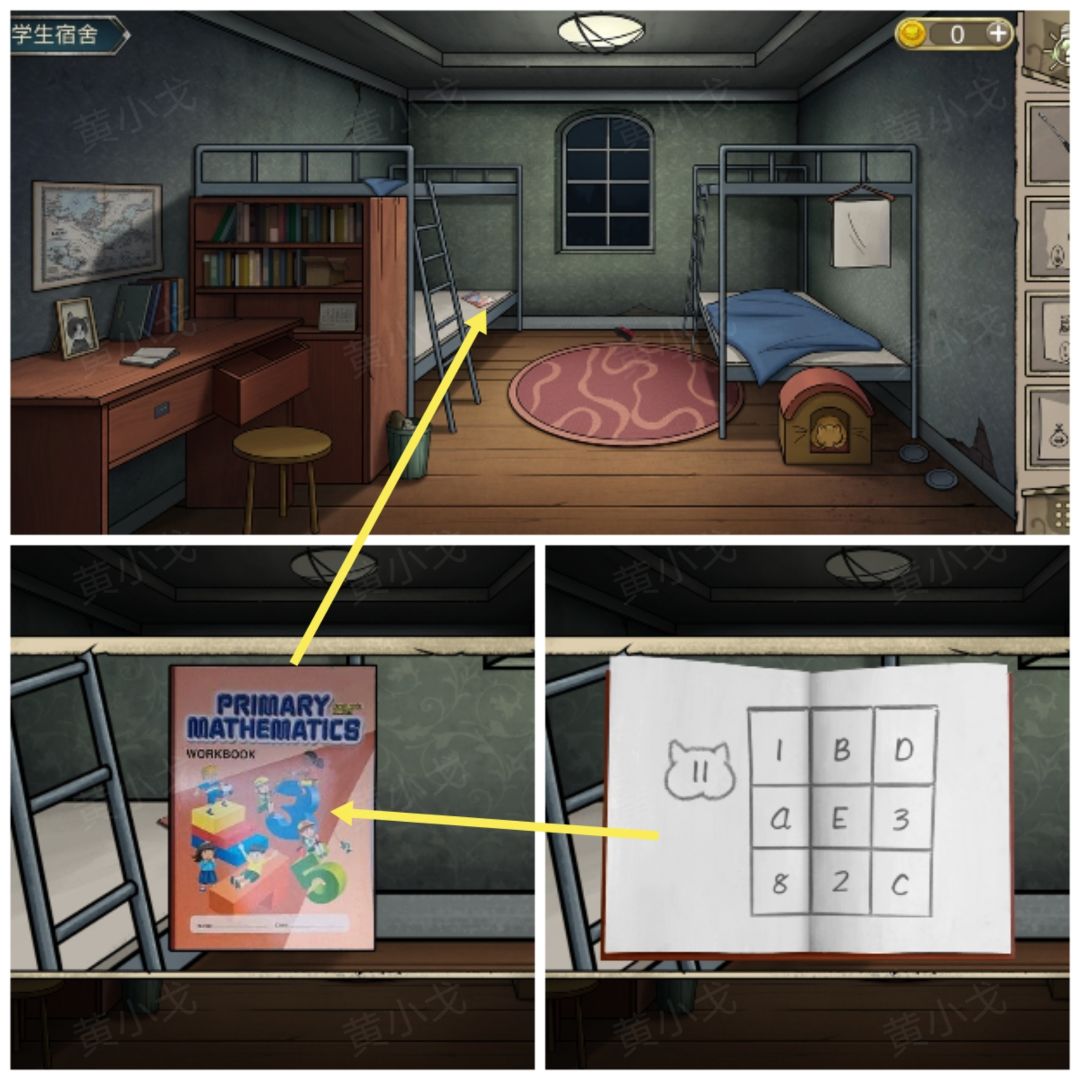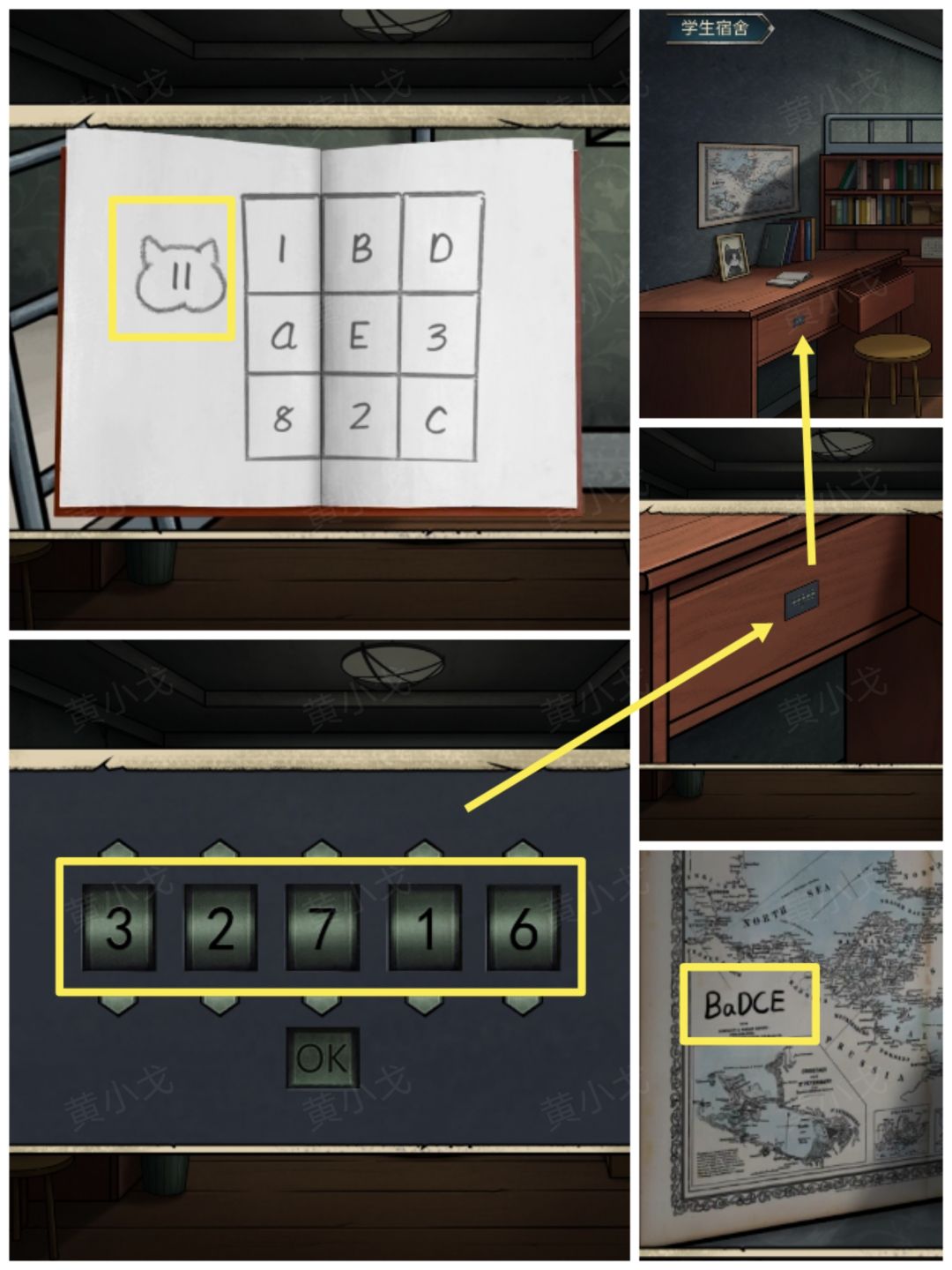18.点击桌子抽屉上的锁,根据书上的线索(BaDCE的位置和对应的数字)和地图上的线索(顺序:BaDCE),输入密码:32716(18-1.书上猫头里的数字是11,表示行列数加起来等于11