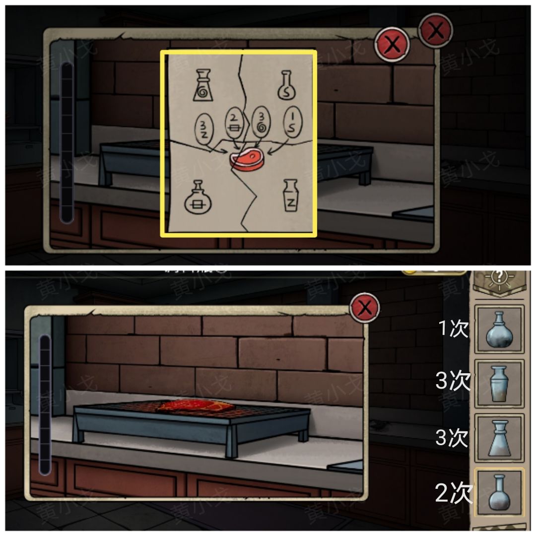 36.根据【纸条】上的线索,按量撒上调料(2号-1次、3号-3次、1号-3次、4号-2次),获得【熟肉片】