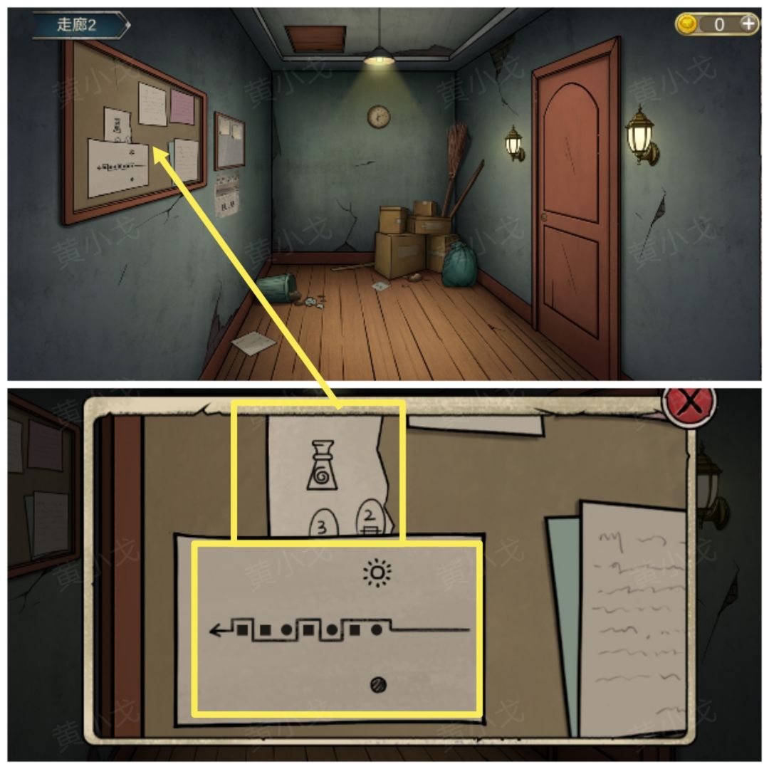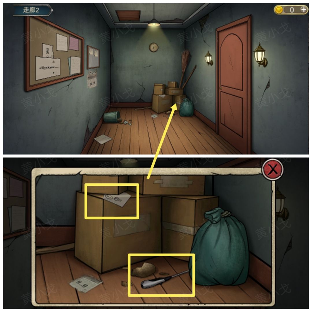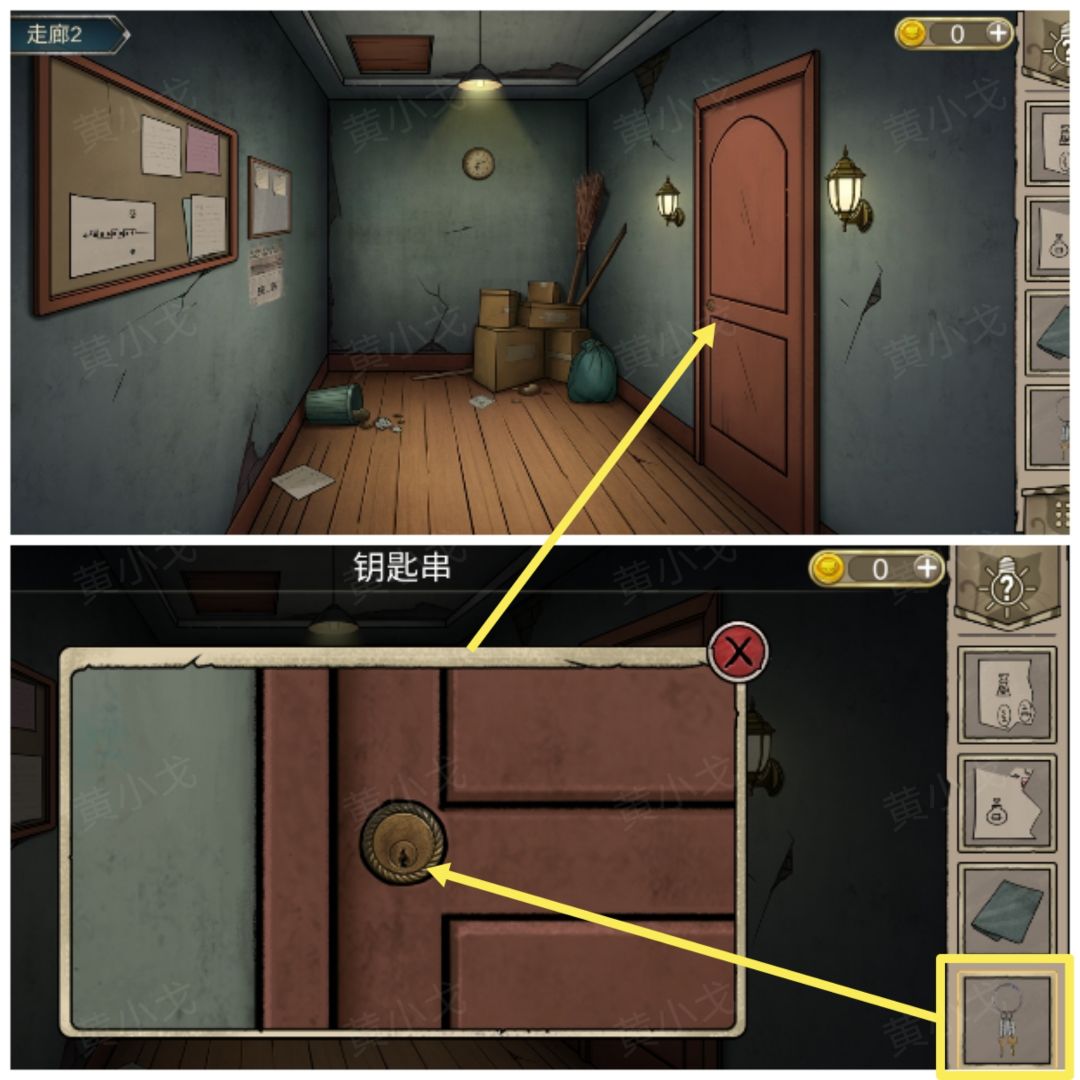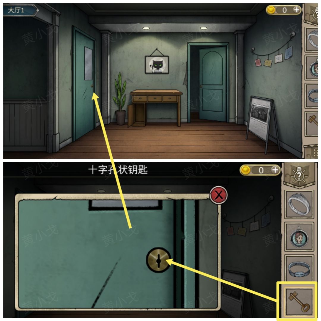 10.(大厅1)点击左边的门,用【十字孔状钥匙】打开门,进入走廊