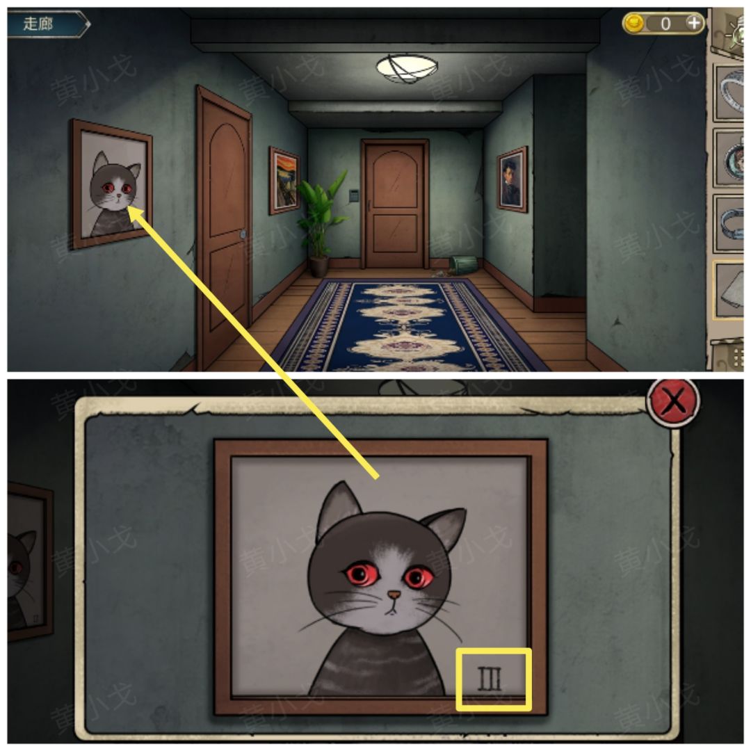 12.点击查看墙上的画(有个罗马数字Ⅲ及猫猫的瞳色:红)