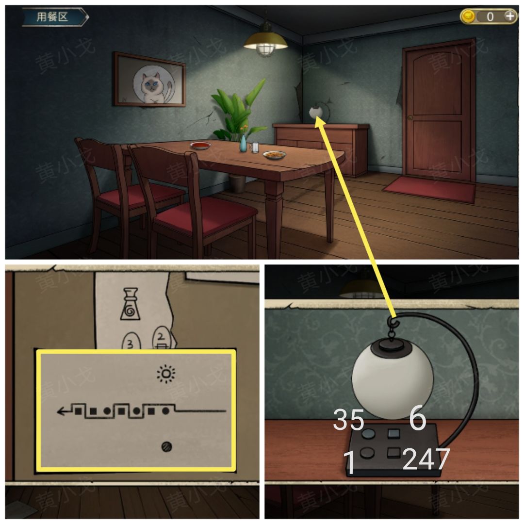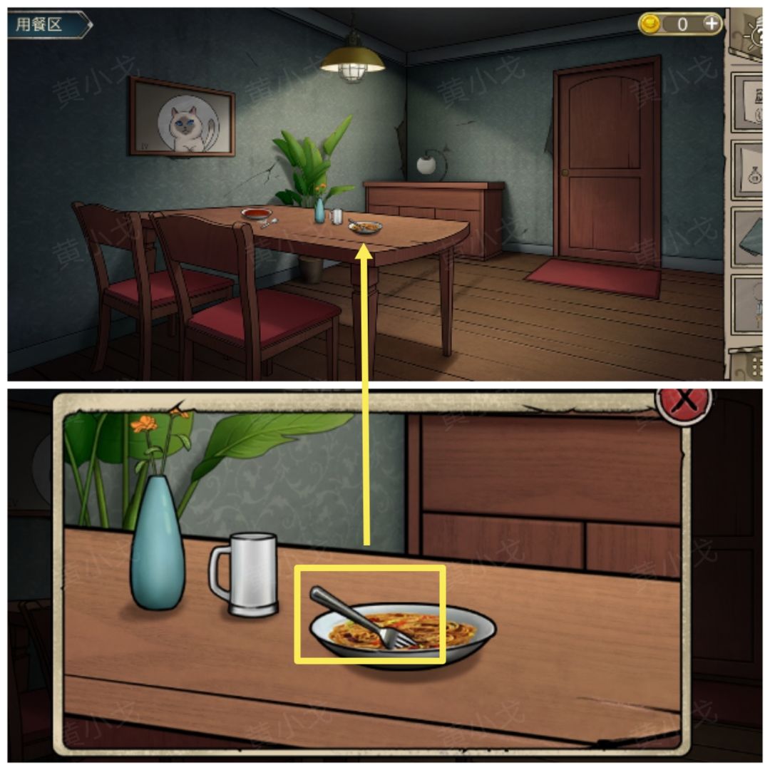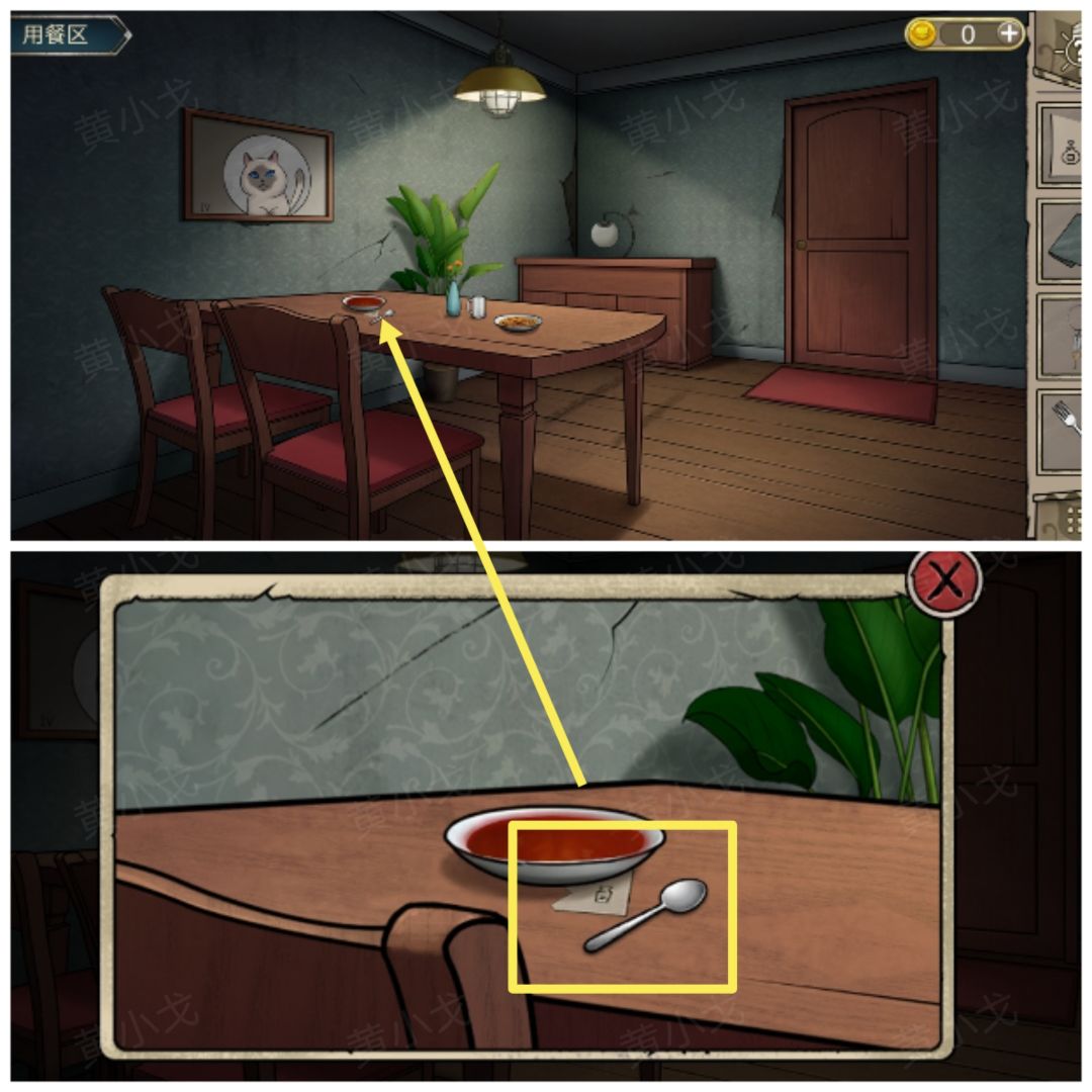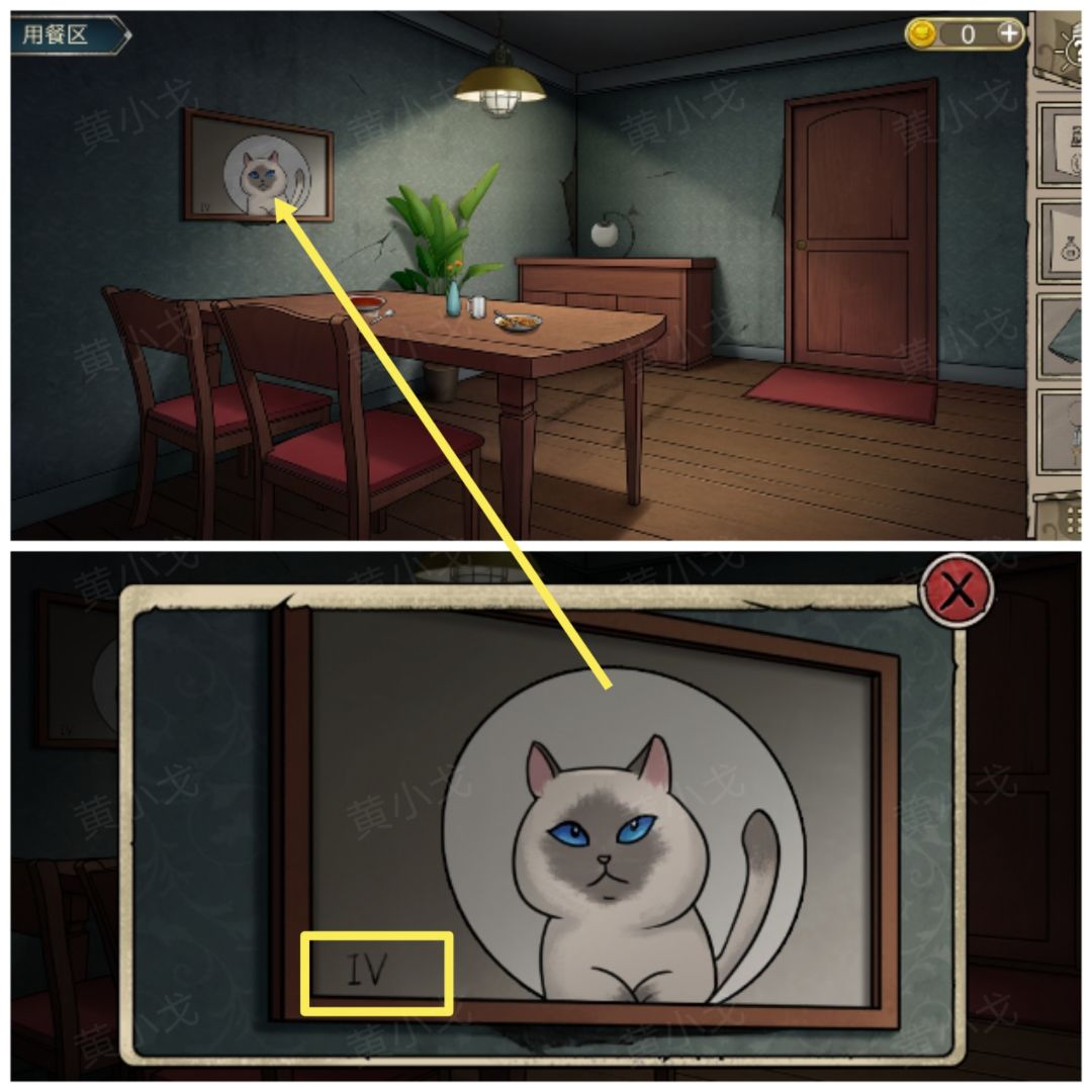 23.(用餐区)点击查看墙上的画(有个罗马数字Ⅳ及猫猫的瞳色:蓝)