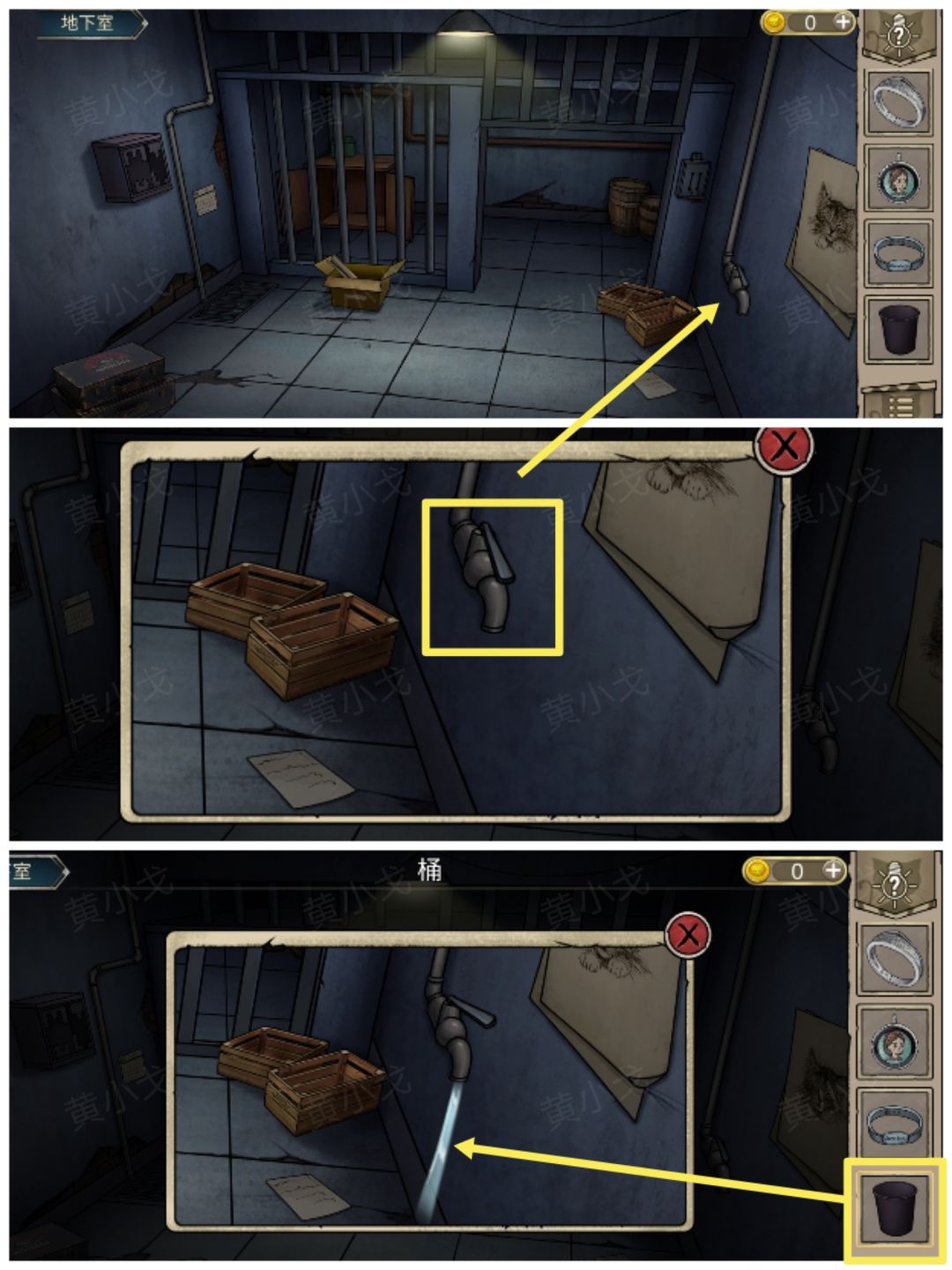 7.点击水龙头,打开,用【桶】装水,获得【装满水的桶】