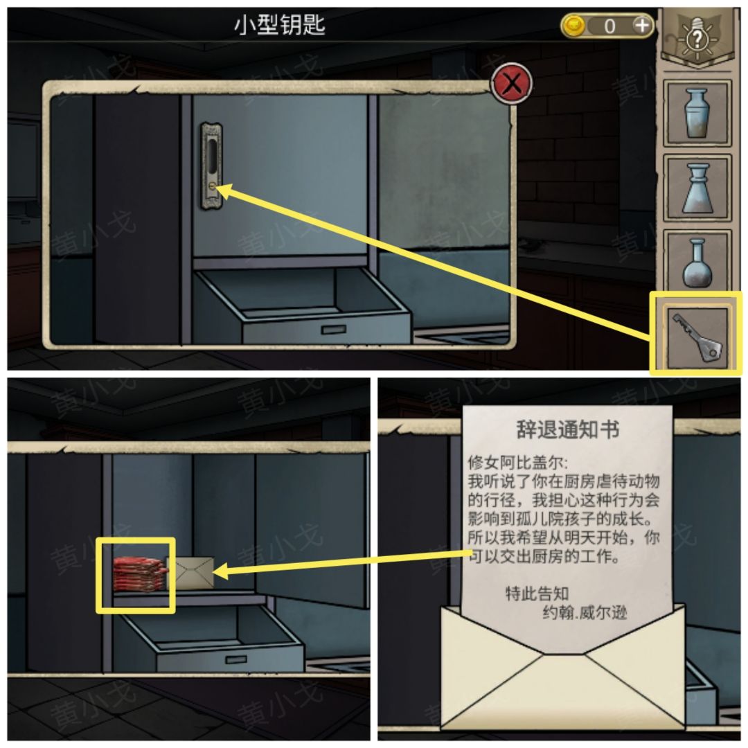 30.用【小型钥匙】打开柜子,获得【生肉片】,查看信件