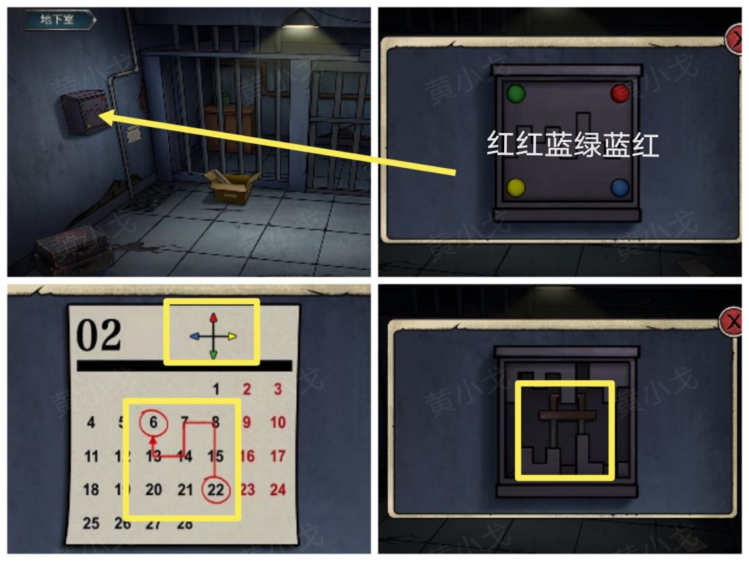 2.点击控制箱,根据日历上的线索(从22到6走过的路线:上上左下左上,和东南西北方位表示的颜色:北-红、南-绿、西-蓝、东-黄),按(红红蓝绿蓝红)的顺序按下按钮;打开控制箱,获得【拉杆】