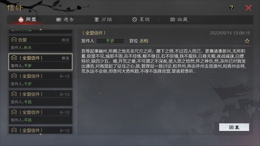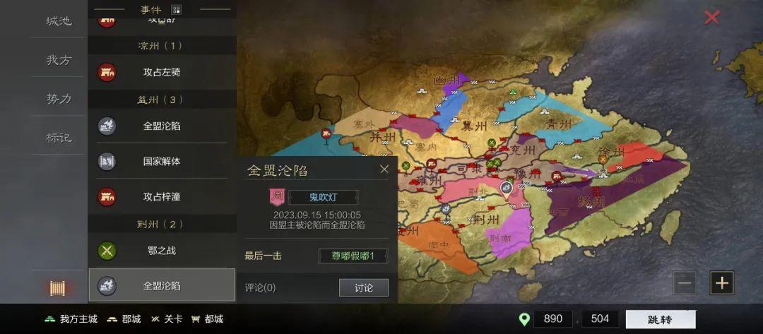 9日晚,扬州盟主拉九州盟主共谈合盟等意见,并表示已同徐、扬、凉、冀等州同盟联盟,在几方谈判阶段遭到其他同盟盟主抵制,随即荆、青、凉、并、幽发布声明,即日起同扬州联盟开战。4019区目前正式分割为两派。