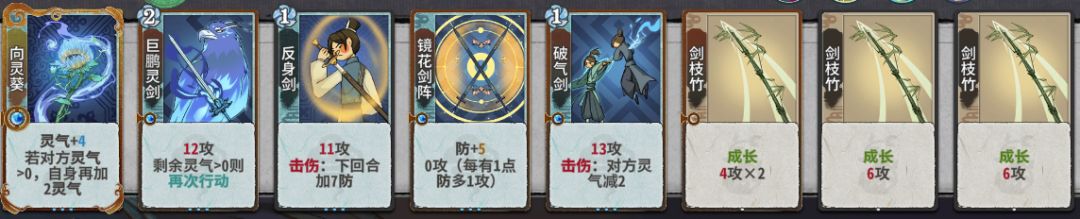 练气:仅使用牧逸风免费的换牌机会,有什么用什么,尽量不使用云剑过渡;获得剑枝竹可以升满在上阵当作三峰剑使用;对于非硬枝竹灵植卡牌,牧逸风可以留着升到二级再吃,龙瑶非剑枝竹灵植卡吃掉保先手。