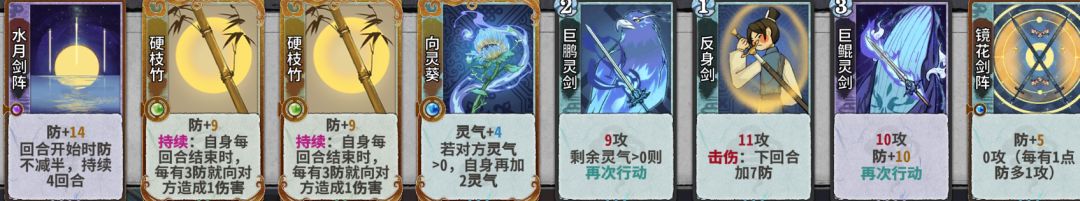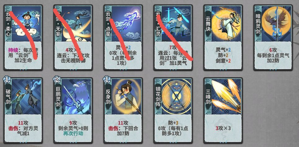 金丹:牧逸风第6轮上,龙瑶第5轮上。善假于物>雷劫>斩道>变换之道>剑阵传承>剑阵守护>灵剑传承>其他二修仙命,机缘看个人可以赌一赌,灵宠血赚,其他不选。开始换牌,找二级浇灌和剑枝竹,优先把如图四张牌d掉,尽量不要吃牌(手牌上限是12张,基本上都是后手),通常打法是灵气巨鹏反身镜花,破气剑对位对手灵气,叶盾花对位对手输出回合以及具有击伤词条的牌,剑意过渡可以留云舞决、凝意决、三峰剑(不推荐,后面成型就仍了,而鹏反身镜花在化神抽到御空连环前还能用)。