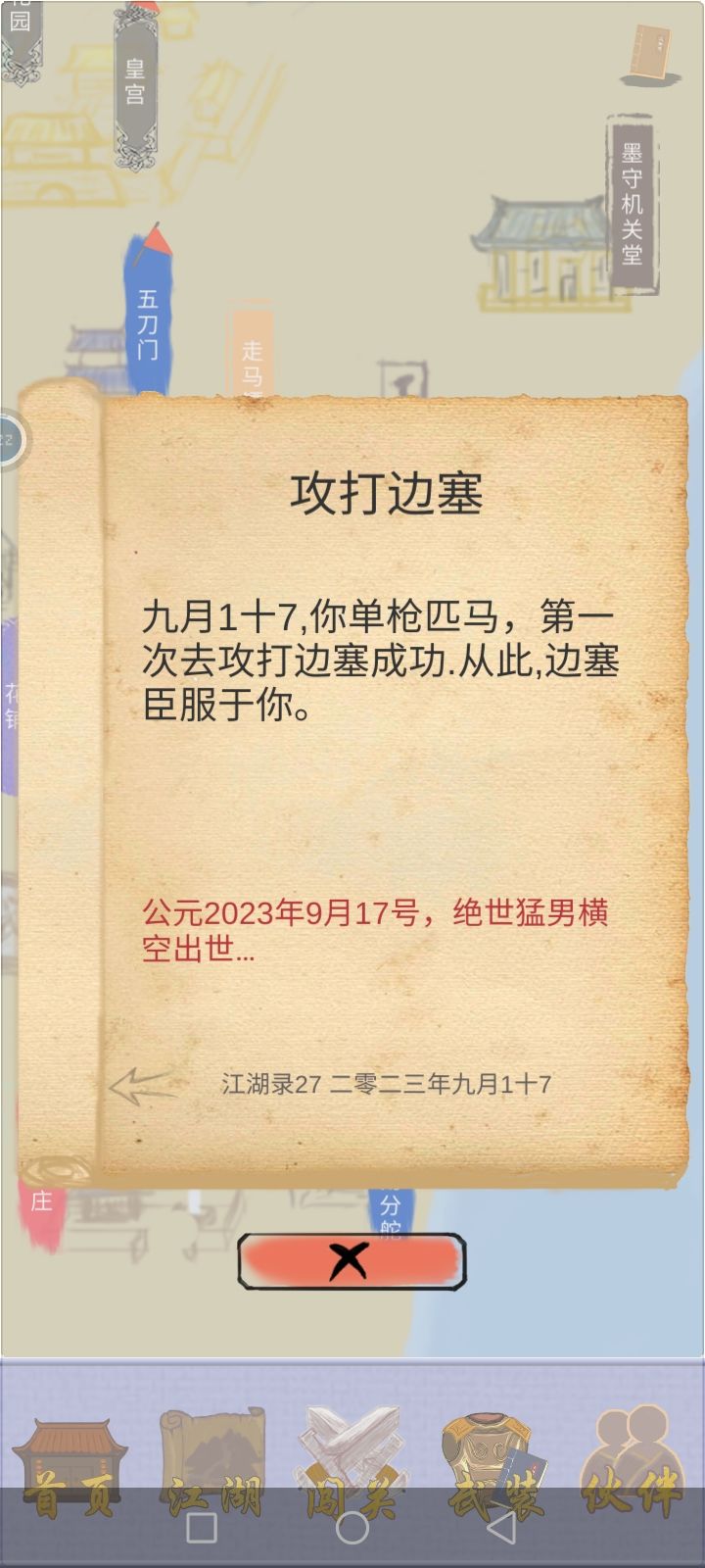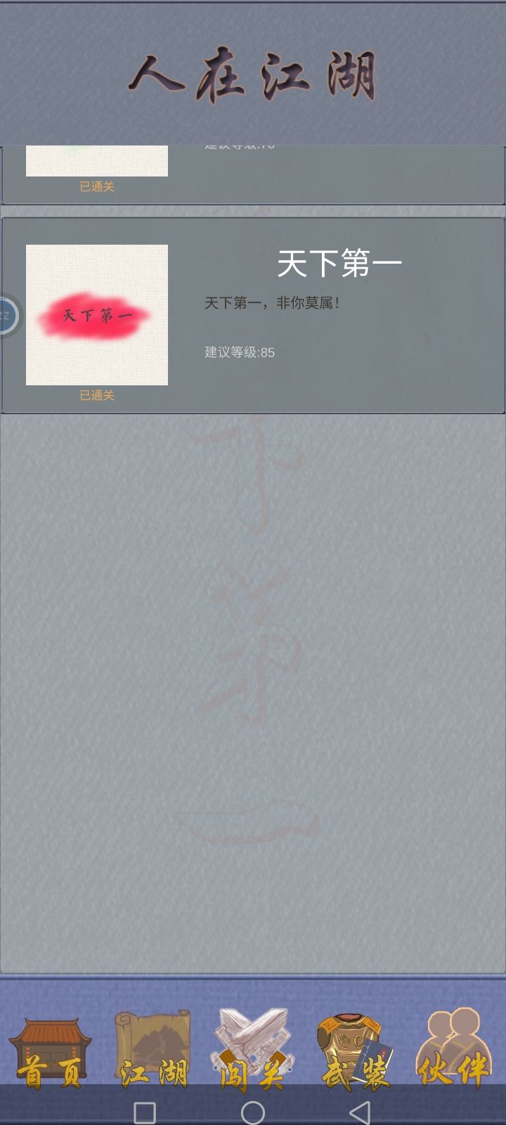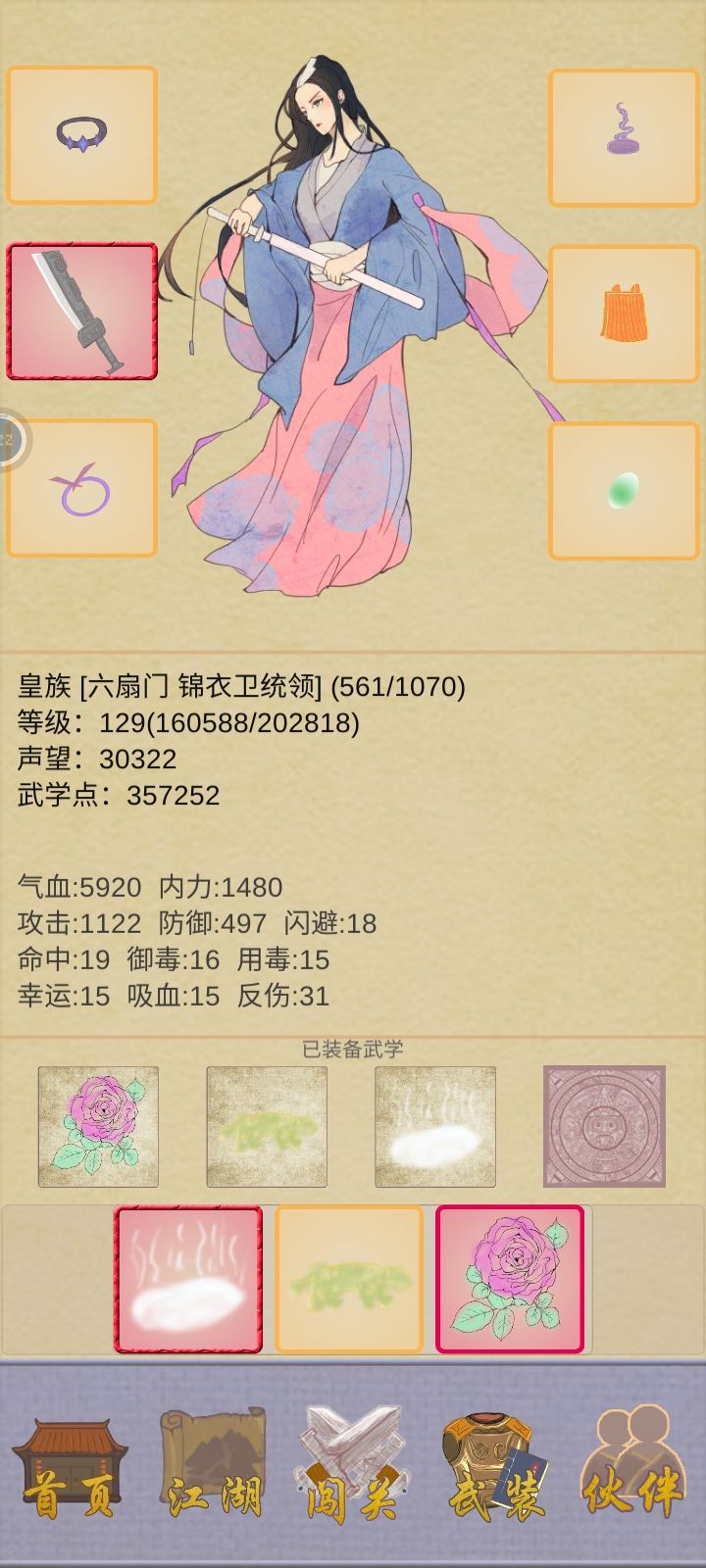 然后开始打野猪,前面三关还好打,到野猪王就需要多刷几件装备才能打的过,集齐一套装备就能通过第一章关卡了,这时候扫荡到七级先去加入玄月魔宫,可以学到一个控制技能,然后去六扇门转职学千军万马,这个技能是群攻技能,可以说是前期的神技。这技能比较耗蓝,所以多扫荡关卡就好了,装备可以卖了换铜钱,到第四章就可以一直扫荡了,卖装备的钱跟扫荡花费的钱差不多。每次扫荡都会给绝学点,这个可以升级技能,千军万马最高是22级133%额外伤害,陌上花香最高18级可以晕全体7个回合,我靠这两个技能不到一个小时就通关了。当然我也是今天第一次玩这游戏,也没看啥攻略,玩第一个角色是男的,所以门派的技能都学了,才总结出来的。