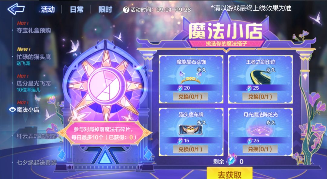 神圣的水晶石回应了你的愿望,这里的一切都归你了~9月1日起,魔法小店活动开启,参与对局积攒魔法石碎片,兑换你的心动魔法搭子!月光魔法阵炫光、王者之剑印迹,还有梅林爱宠猫头鹰车牌等,千万不要错过啦!