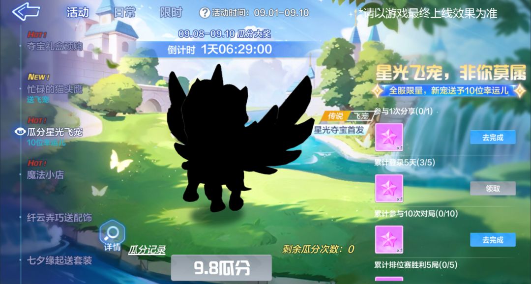 煽动洁白翅膀的天马带着纯净的光芒飞翔而来!全新传说飞宠即将登场,9月1日起,率先开启【瓜分星光飞宠】活动,活动期间完成指定任务可获得许愿星星,每个许愿星星等于1次瓜分机会!