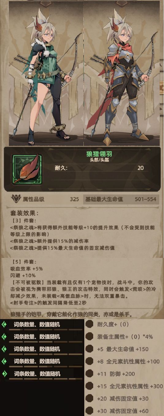 套装效果:吸血、闪避、【祭狼之魂】强化、【射手专注】强化、普攻附加【邪狼】、【狼王】、【荒咬】效果。