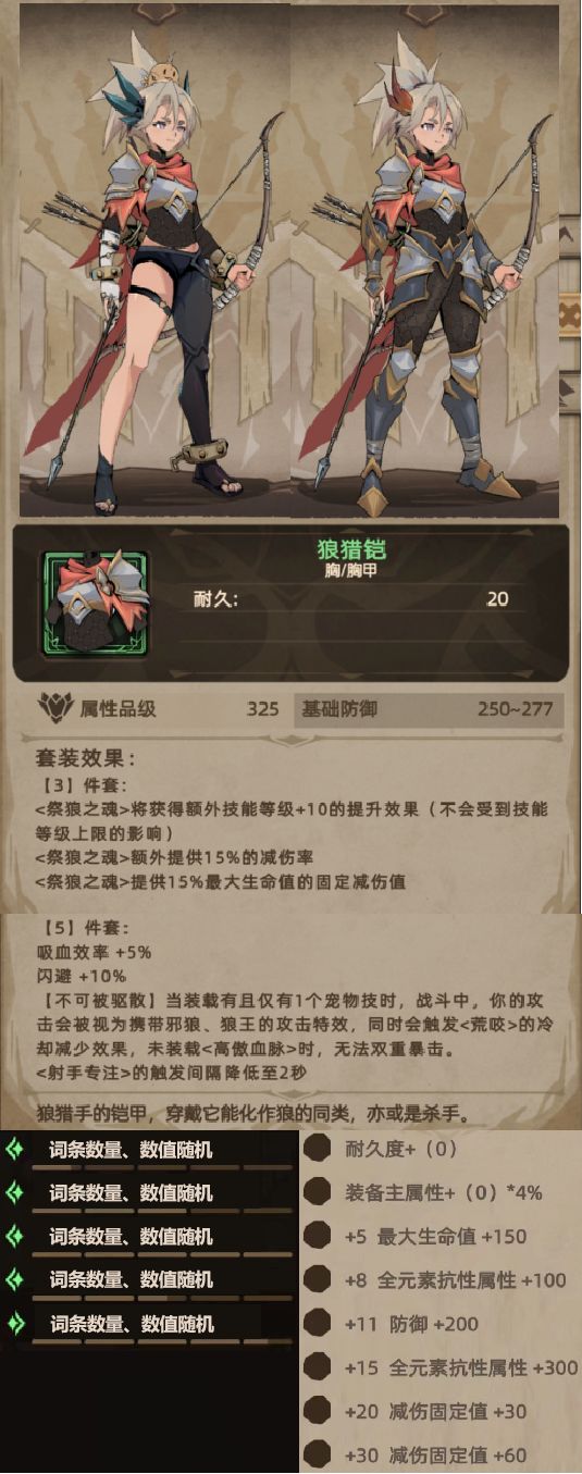 套装效果:吸血、闪避、【祭狼之魂】强化、【射手专注】强化、普攻附加【邪狼】、【狼王】、【荒咬】效果