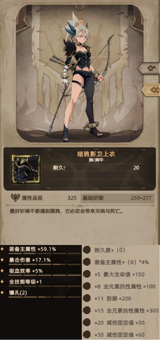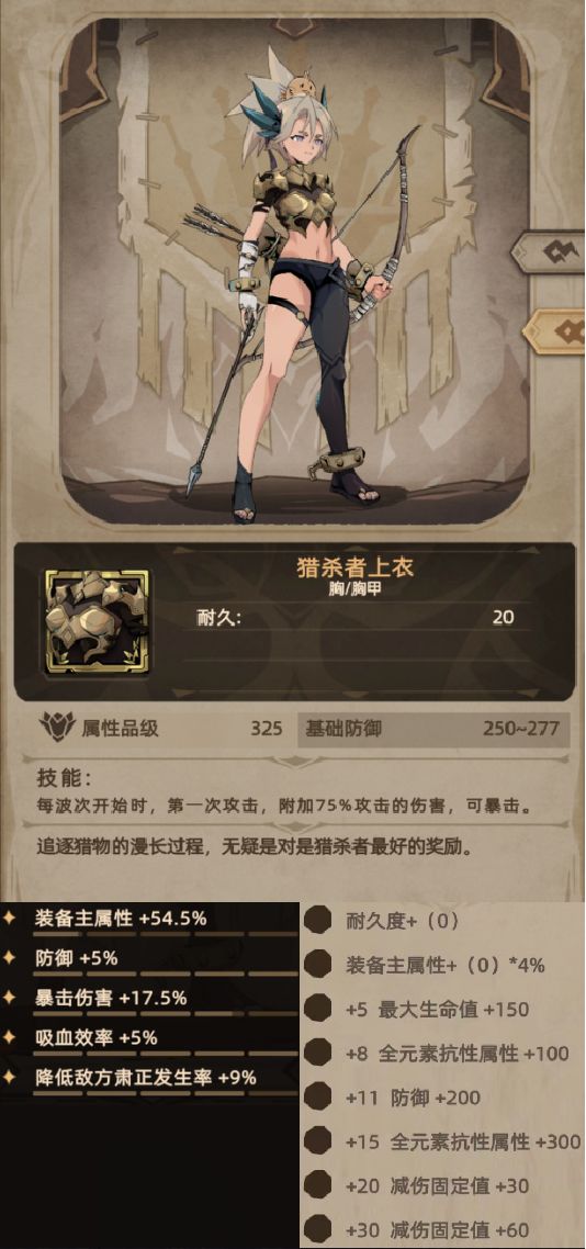 关键词:装备主属性、防御、爆伤、吸血、降低肃正、附加伤害(每波1次)。