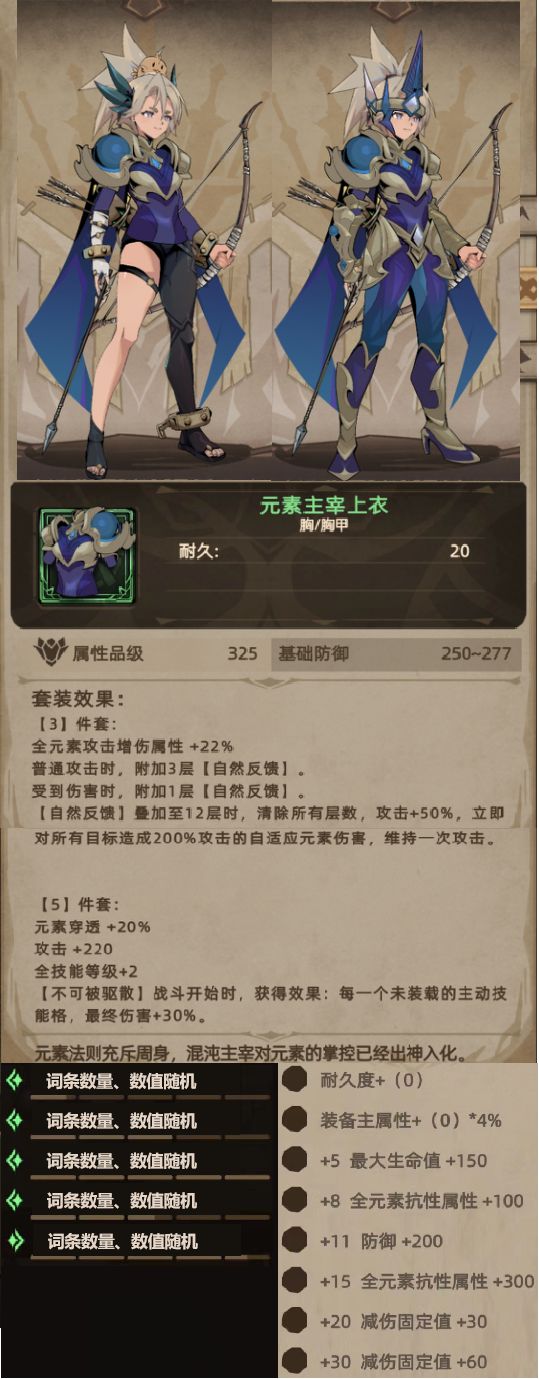 关键词:装备主属性、元素增伤、暴击、爆伤、闪避、减伤(每波2次)、闪避(每波2次)。