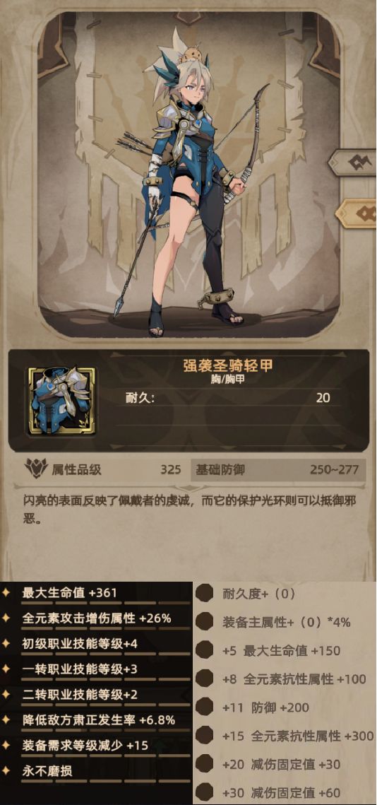 关键词:生命、元素增伤、初级技能等级、一转技能等级、二转技能等级、降低肃正、降低需求、永不磨损。