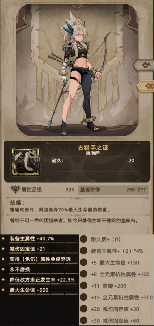关键词:装备主属性、减伤、降低肃正、最大生命、免伤贯通、永不磨损、附加伤害(最大生命值70%)
