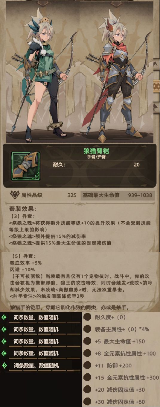 套装效果:吸血、闪避、【祭狼之魂】强化、【射手专注】强化、普攻附加【邪狼】、【狼王】、【荒咬】效果。