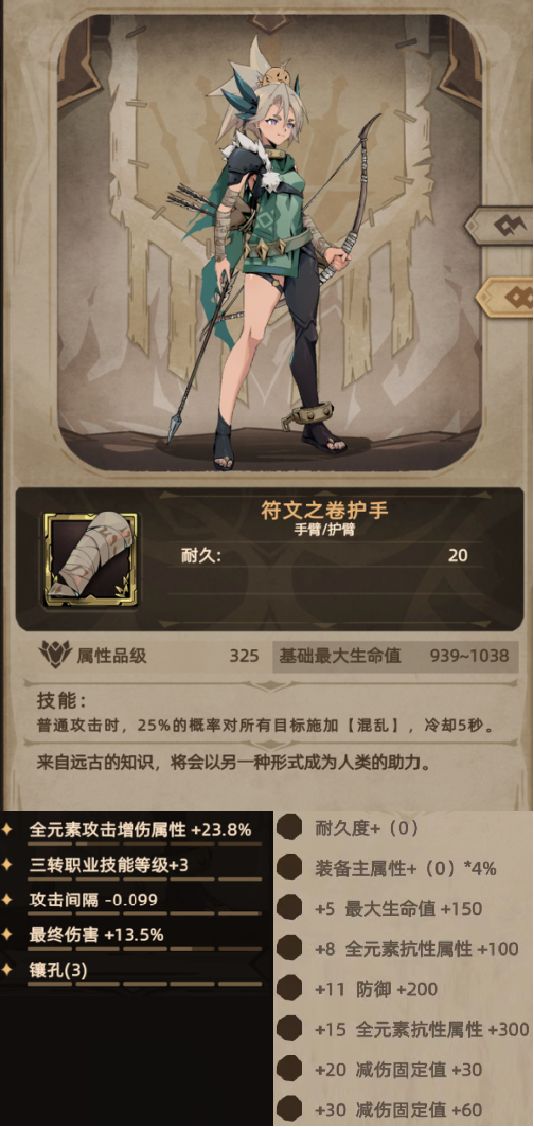 关键词:元素增伤、三转全技能等级、攻速、最终伤害、镶孔、附加混乱(25%概率)。