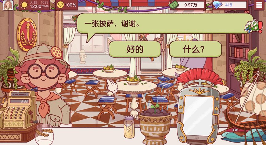 拿到鲜蓟种子,终于可以开始搜查欧阳博士,接任务:收获300个鲜蓟,和之前的任务大同小异。搜查时点击左边的相片、相片旁边的学位证明、拉开身后的帘子点击瓶子勺子娜比萨的信件(哇哦)黑板上的模型图、右边的奖杯(解锁成就《科学发现》)。把黑板上的连锁店模型图拿给欧阳博士看,了解到冷冻披萨企划。