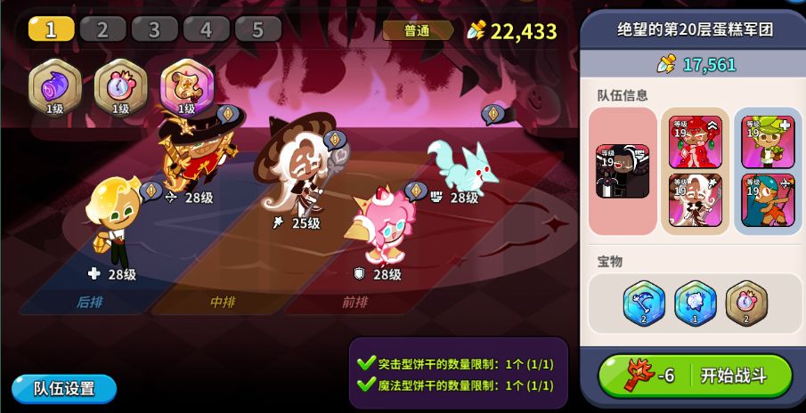 第二十层支援buff是一位突击型一位魔法型,以下阵容即可过关。饼干均为携带配料,技能等级均为10级。