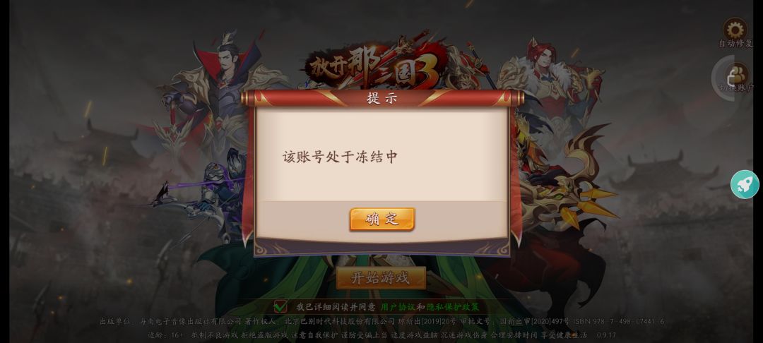 刚充6块玩了一会提示了个啥没看清,再上就冻结了。4399平台,126区,魏将