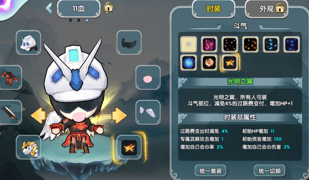⑨血套,比较杂,都是其他部分附带属性。比较难获得是背部丞相翅膀和斗气。图中四个斗气(第一和后三)都是有着加血效果的,但四个获得难度都一样高。剩下四个属于普通斗气。