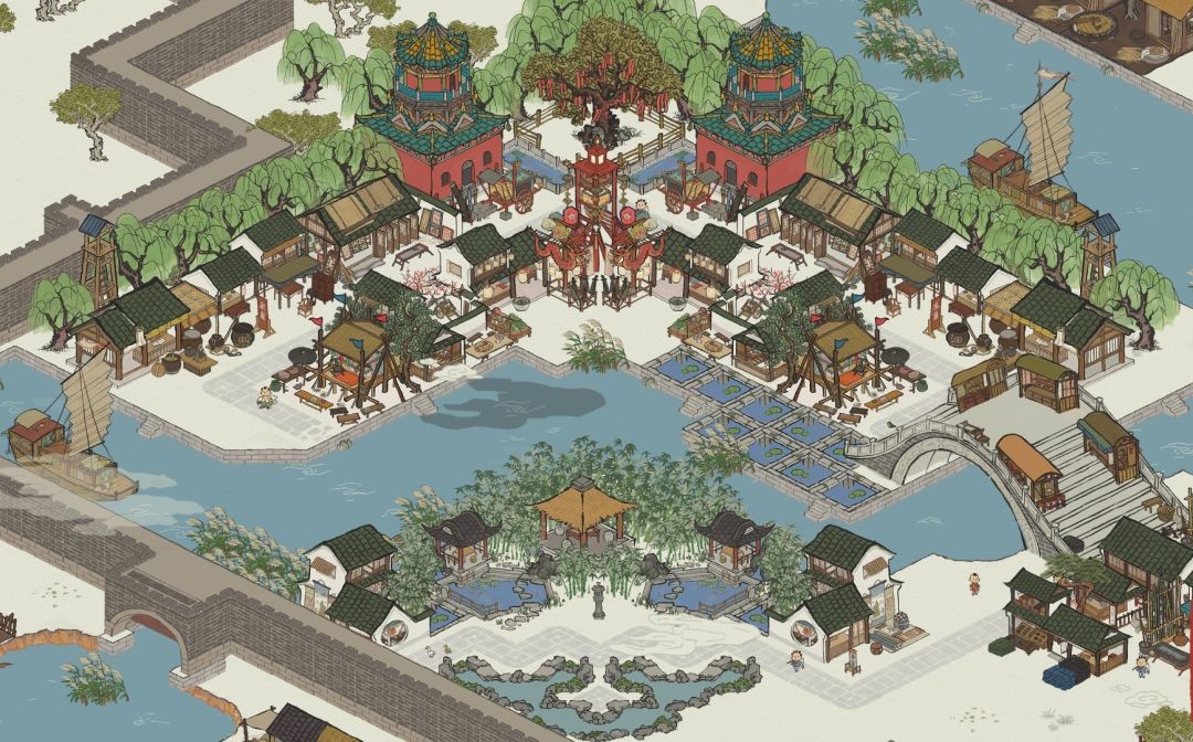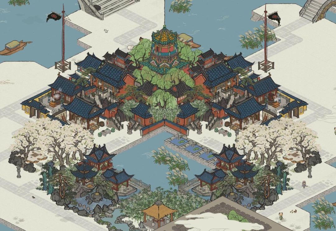 这张图是来自之前帖子的布局的完善版(原版请参考之前的帖子),将后方的油树林换成了铸钱所(抛开顶上一侧多出一个窗口,它也还算是沿着对角线对称),取消了紧挨着水池的两个家具店,添加了两个补天石建筑石舫。
