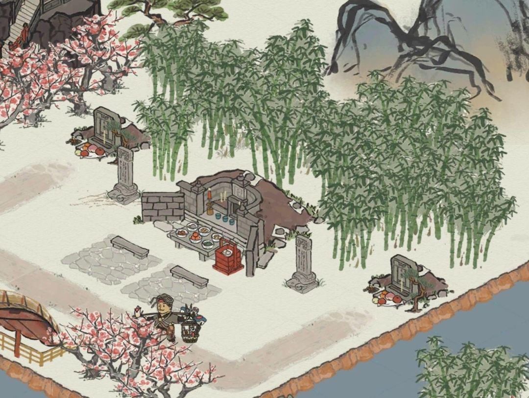上图是一个墓地的布置方案,中间的大坟墓需要居民死后花100补天石购买,两边两个小的坟墓是居民死后最便宜的那一款坟墓(花铜币购买)。
