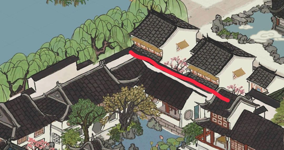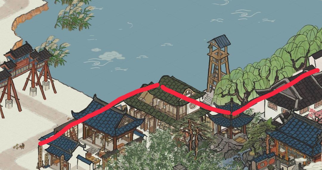 首先用钓鱼台的亭子遮住东园自带围墙的转角处,然后转过90度角修建围墙,这样这两段围墙可以毫无违和的接在一起,然后在图示位置修一个花窗店,仔细观察可知花窗店左上方自带一段围墙,而这段围墙又恰好于左下方书局自带的那一小段围墙在一条直线上,由此便形成了图示红线这一长段连续(伪)的围墙,东园面积由此得以扩大。