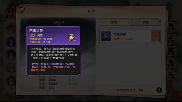 弟子消耗【修为丹】可以快速增长弟子境界修为,这是游戏中最重要的修为获取途径。