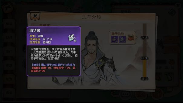 在世界地图与仙友结交,说不定也能获得仙友赠送【游玉京】【琼华露】等佳酿。(温馨提示:弟子喝太多酒是可能染上“酗酒”怪癖的哦~)