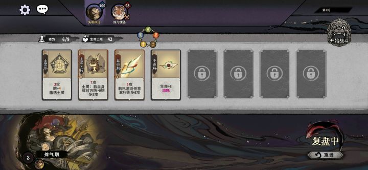 前期用土或金等过渡,中期可用火土卡牌过度(后期的土灵·合八荒金卡防御很强)。前2轮多换牌,胜利可多加两张次换牌机会,第3轮后每轮可换牌一次,元婴时要把换牌次数全用掉再上化神!!!