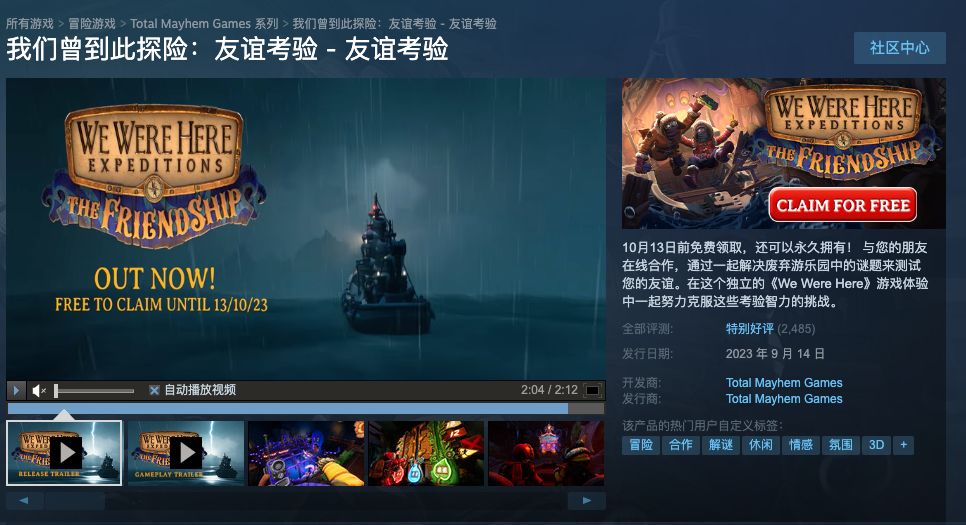 双人合作冒险游戏系列《We were here》作品:《我们曾到此探险:友谊考验》现已在Steam平台开启限时免费,10月13日前即可免费领取并永久入库。游戏共收获2485个评价,好评率为84%,属于“特别好评”。